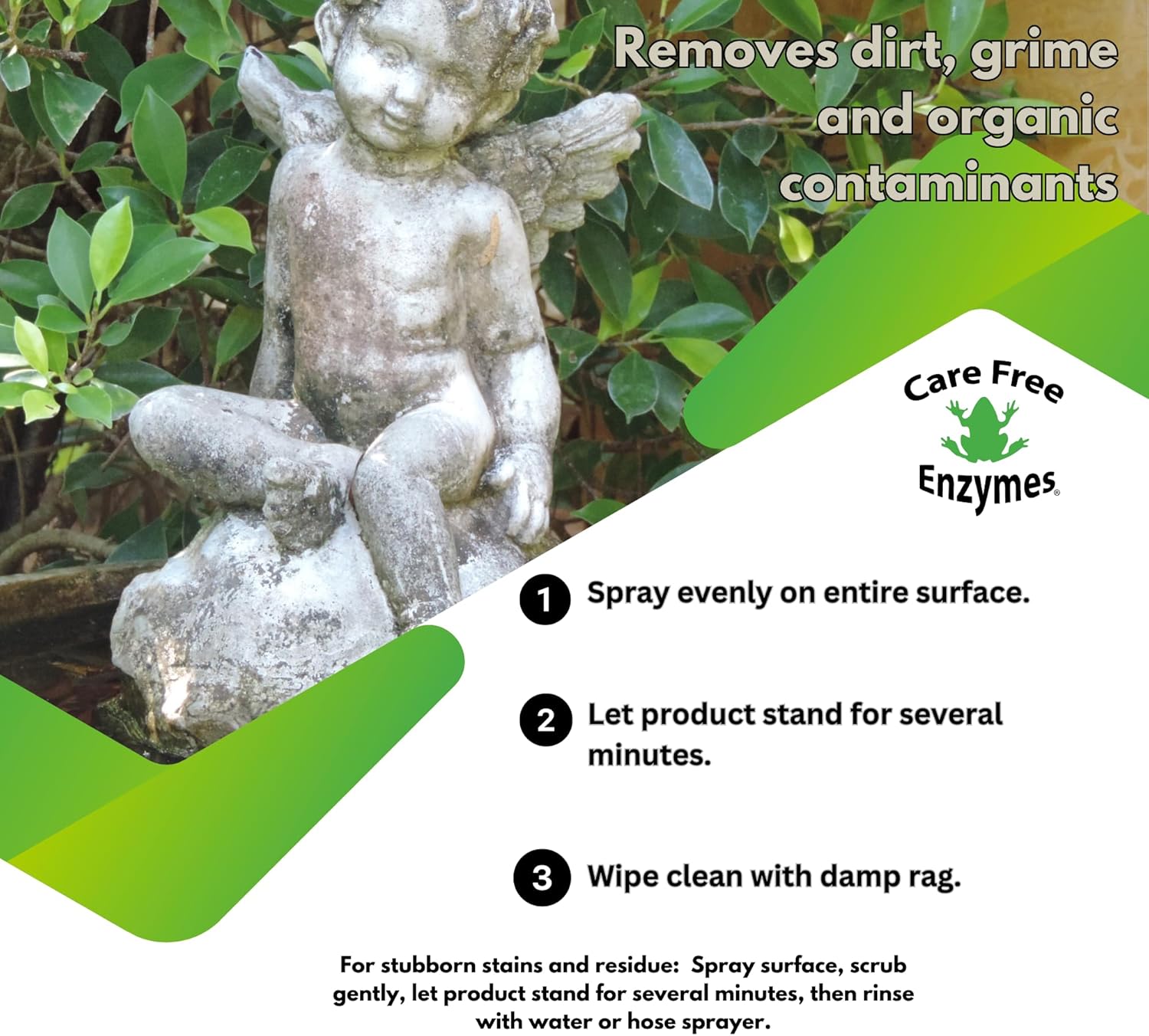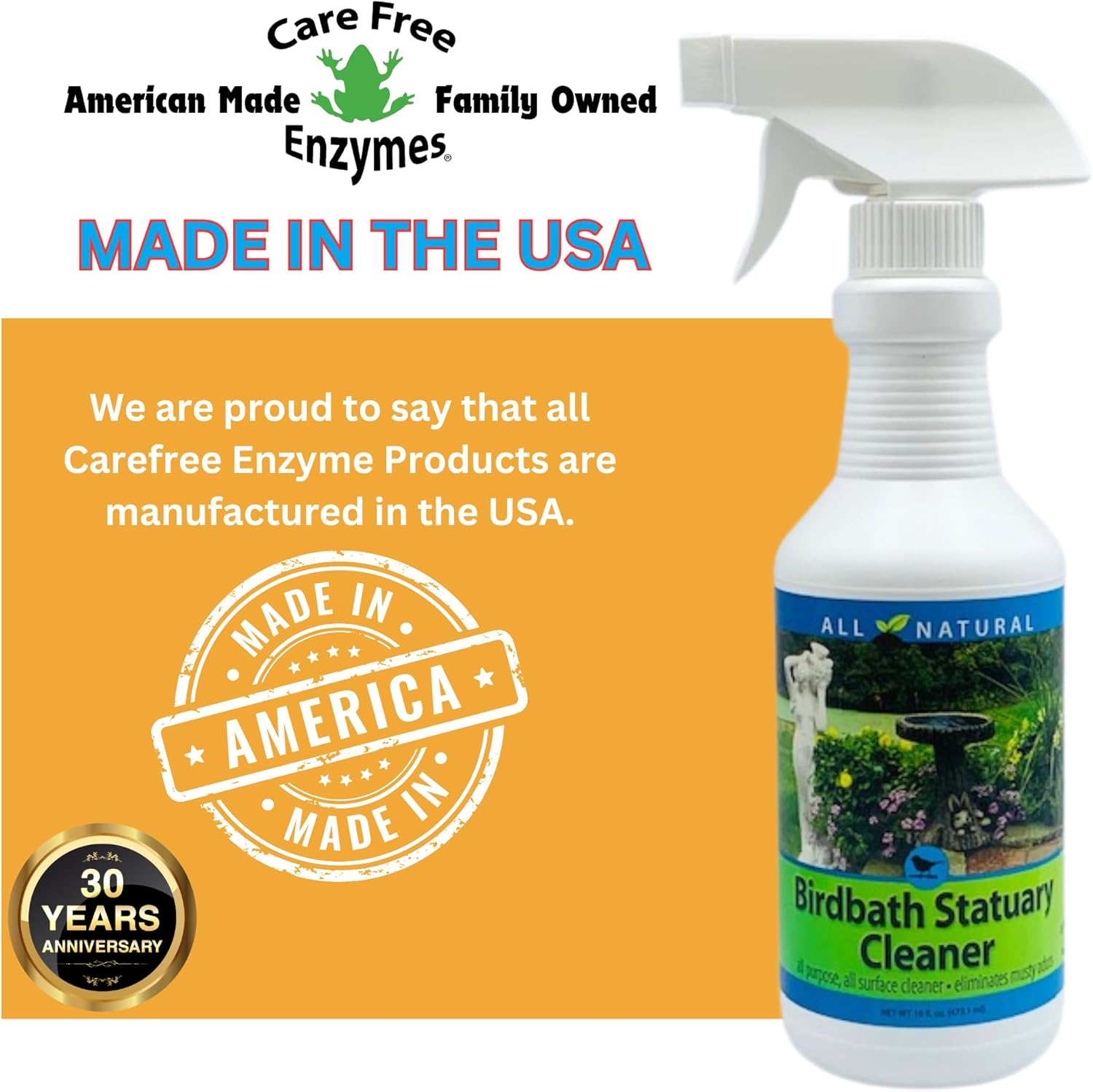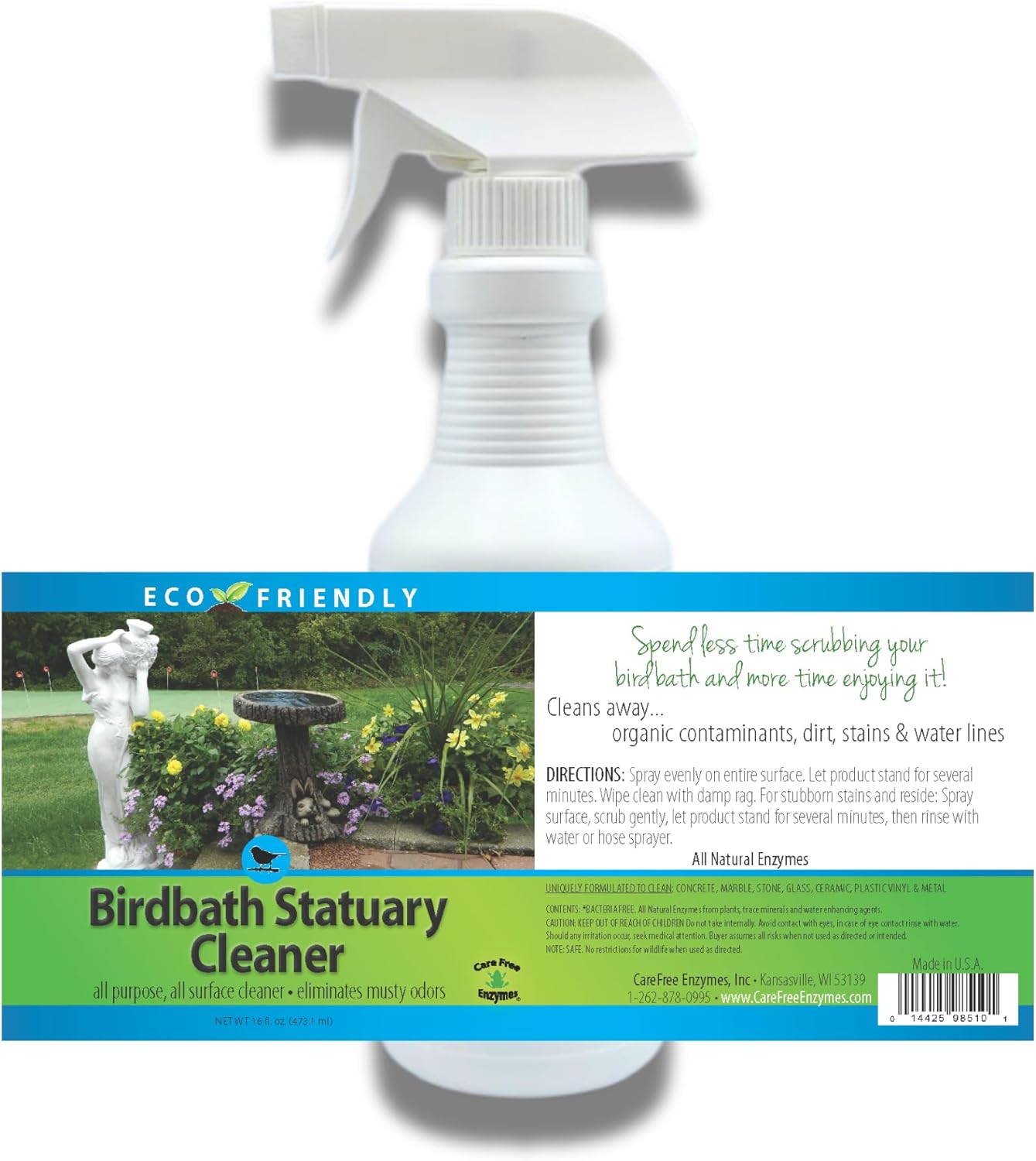 Birdbath & Statuary Cleaner is the ultimate cleaner for outdoor decor. Using natural enzymes, this product quickly works to loosen organic stains and debris so they can quickly be wiped away. Works on algae, water lines, dirt/grime. Simply spray on stains, let stand for one minute then wipe away. Carefree Enzymes has been proudly making this great product in Wisconsin since 1995, we know you will love it as much as we do.