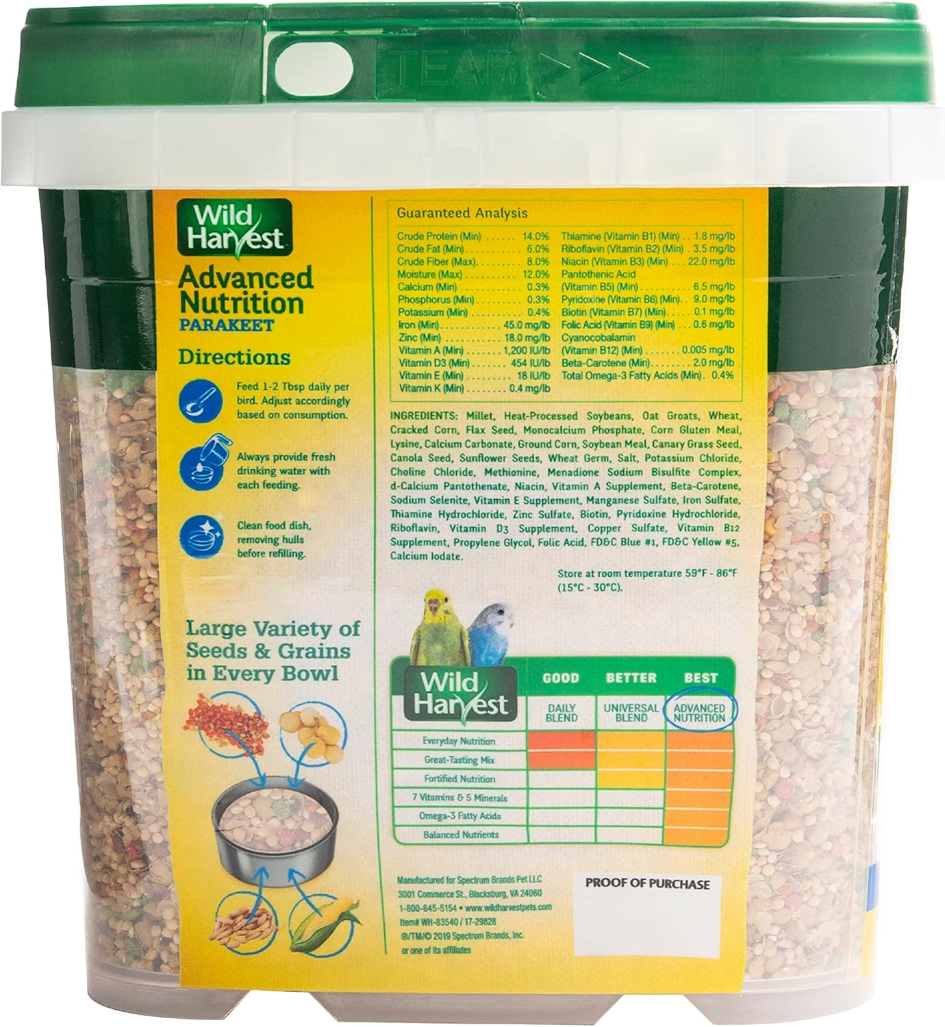 Advanced Nutrition: Wild Harvest Advanced Nutrition Diet for Parakeets provides the ultimate nutrition your bird requires for developing, maintaining and enjoying good health. Parakeets need a well rounded diet containing seeds, fruits and vegetables to help support a longer, healthier life. This specially formulated, enriched food contains important protein, fat, vitamins and minerals that support a strong and healthy body for your Parakeet. Color Amp Formula: Wild Harvest Advanced Nutrition Diet for Parakeets offers health and nutrition for your pet with the addition of our Color Amp Formula. With added antioxidant nutrients, carotene and other natural sources of beta carotene; our Advanced Nutrition Diet helps support and maintain overall good health. Great Taste Parakeets Love: The uniquely formulated Wild Harvest Advanced Nutrition Diet for Parakeets contains a tantalizing array of seeds and delicious fruits and vegetables for a delectable food mix your Parakeet will be sure to love! Directions: Keep feed cup filled with fresh food. Remove hulls of consumed seed. Always keep fresh water available.