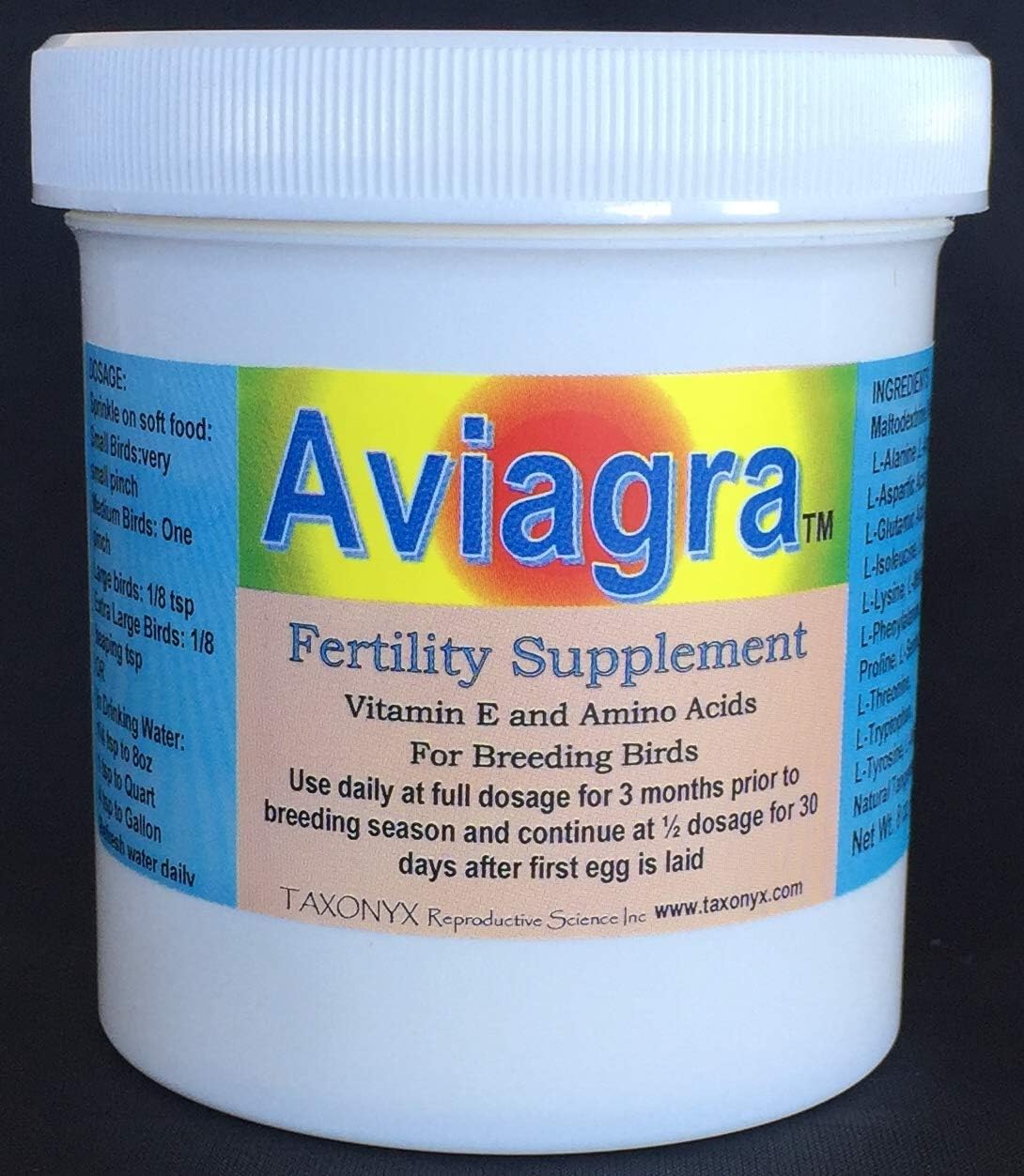 Aviagra Fertility Supplement: A special mixture of vitamin E and essential amino acids in a pleasant natural tangerine flavored base. Feed by sprinkling on soft food: fruit, vegetables, sprouts, etc. Good for all adult birds from canaries and budgies to amazons and cockatoos. Ingredients: Maltodextrine, Vit. E, (D, L, Tocopherol Acetate), L-Glutamic Acid, L-Leucine, L-Aspartic Acid, L-Lysine, L-Isoleucine, L-Alanine, L-Valine, L-Threonine, L-Serine, L-Phenylalanine, L-Proline, L-Arginine, L-Glycine, L-Methionine, L-Cystine, L-Histidine, L-Tryptophan, L-Tyrosine, Natural Tangerine Flavor.
