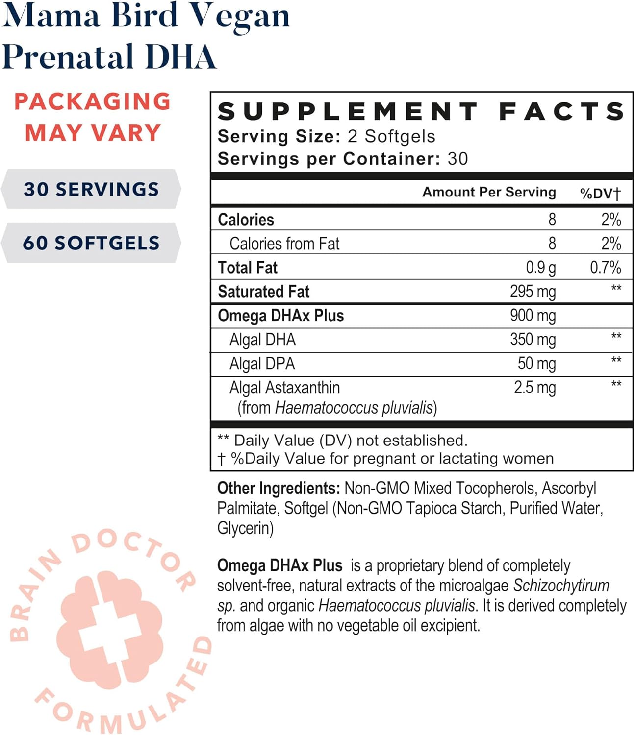High-Potency Omega-3 Formula: Mama Bird Vegan Prenatal DHA delivers 350 mg omega-3 DHA and DPA per serving from sustainable algae oil