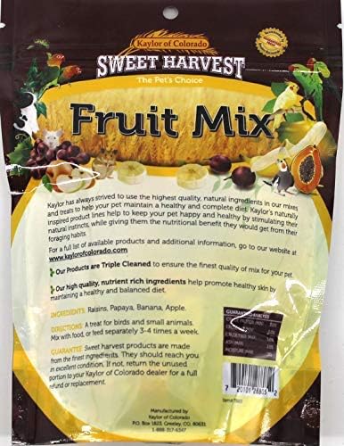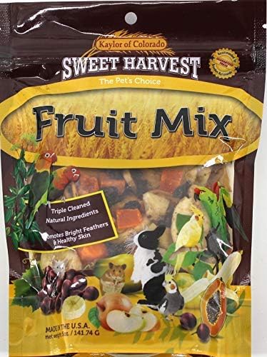 Sweet Harvest Fruit Mix 5.0 Oz Bag Sweet Harvest was first formulated and introduced in 1977. At the time there was only a very limited selection of natural products for bird and small animals. Many of the products available only offered artificial colors and flavors. Sweet Harvest was the first to achieve its colorful appearance by using all-natural ingredients. Kaylor has always strived to use the highest quality, natural ingredients in our mixes and treats. Ingredients: Raisins, Papaya, Banana, Apple. Directions: A treat for birds. Mix with food or feed separately 3-4 times a week.