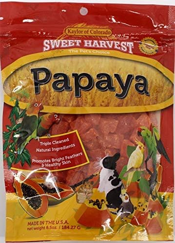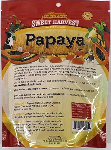Sweet Harvest Papaya 6.5 Oz Bag Sweet Harvest was first formulated and introduced in 1977. At the time there was only a very limited selection of natural products for bird and small animals. Many of the products available only offered artificial colors and flavors. Sweet Harvest was the first to achieve its colorful appearance by using all-natural ingredients. Kaylor has always strived to use the highest quality, natural ingredients in our mixes and treats. Ingredients: Papaya, Sugar, Sulphur Dioxide, Calcium, Citric Acid, Artificial Color (FD&C yellow #5 and/or #6). Directions: A treat for birds. Mix with food or feed separately 3-4 times a week.