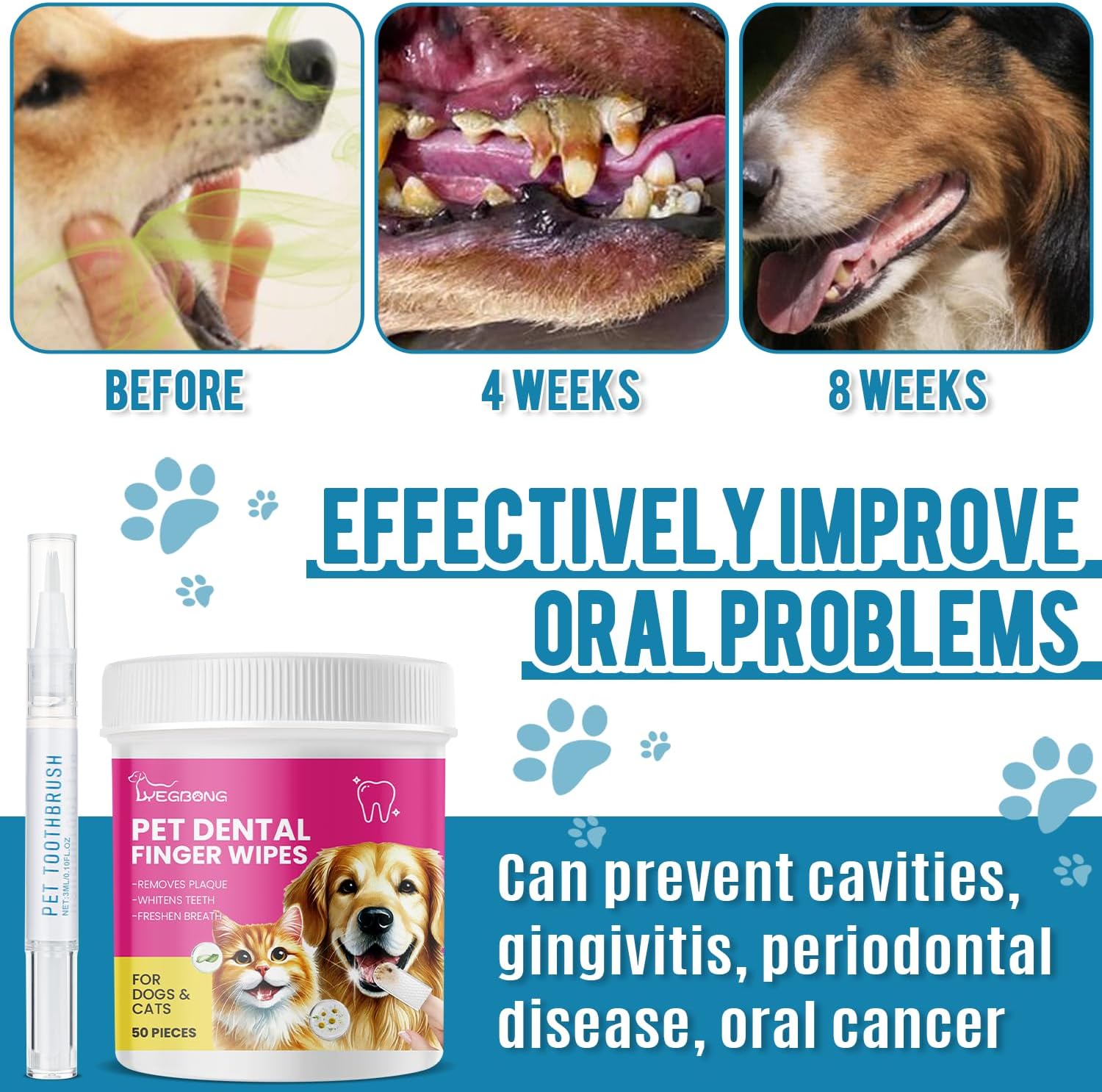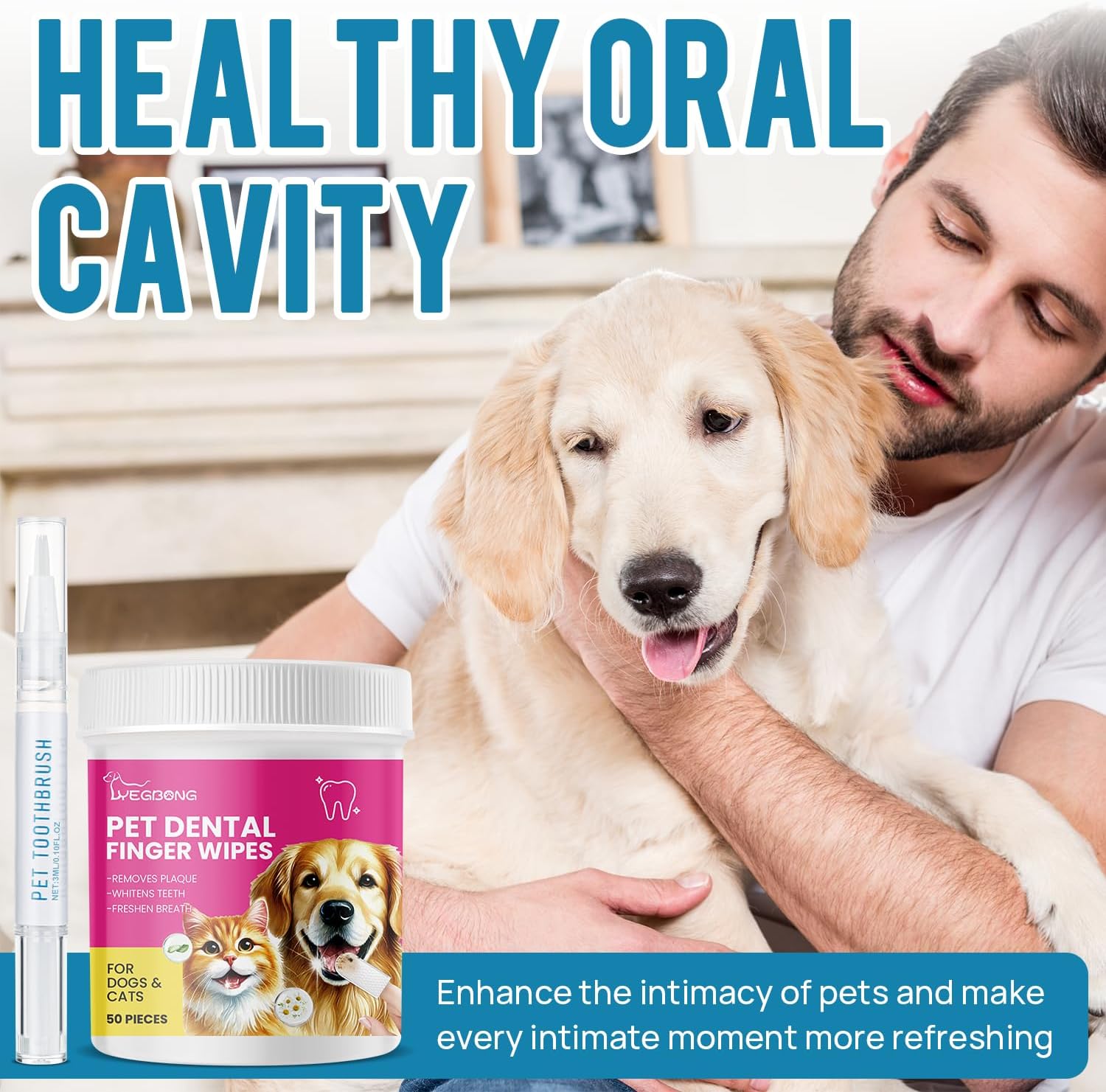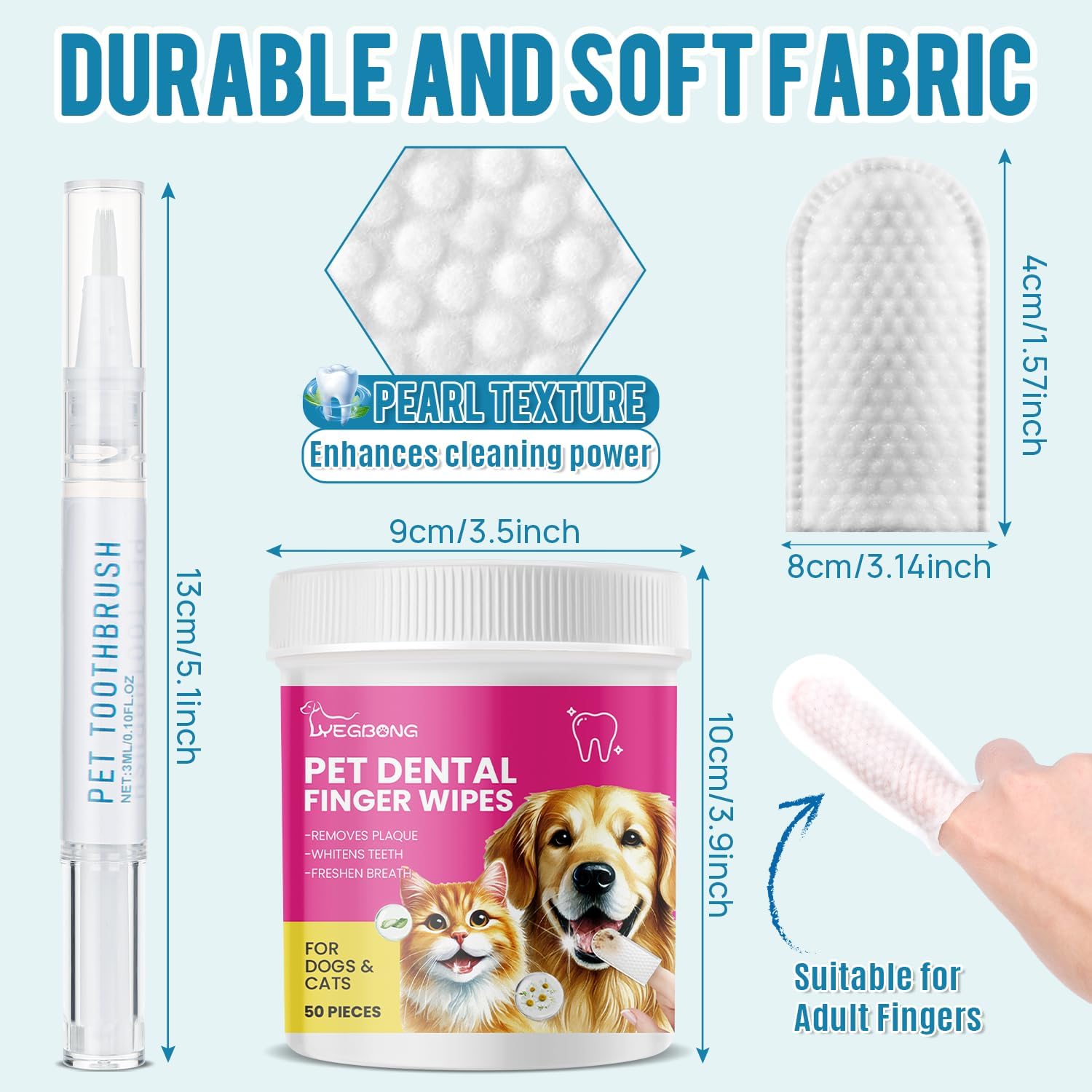 Dog Tooth Cleaning Kit – Dental Care Finger Wipes 50pcs & Toothbrush – Best Teeth Cleaning for Dogs, Puppies, Cats – Plaque Reduces, Freshens Breath, Healthy Teeth & Gums