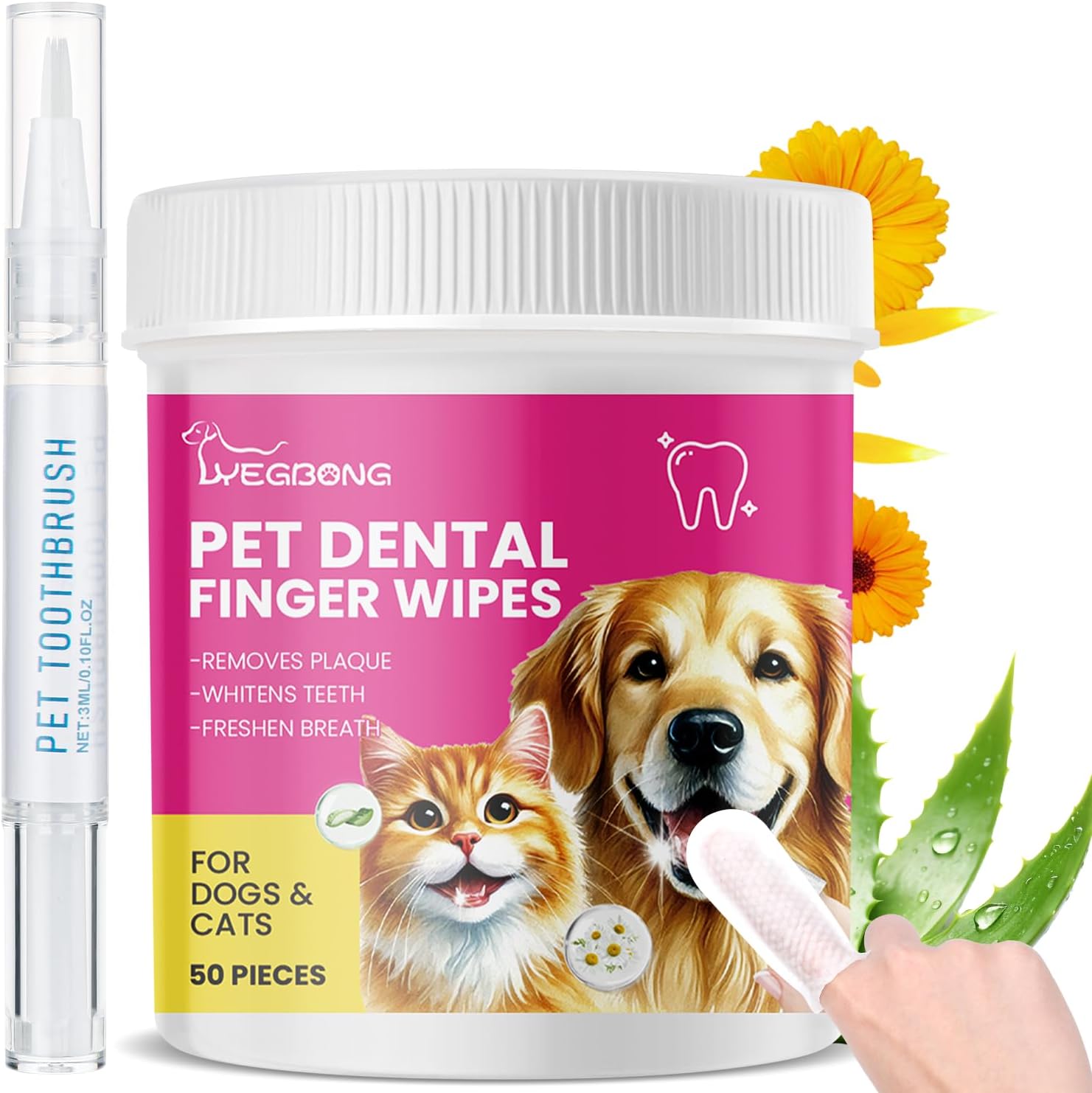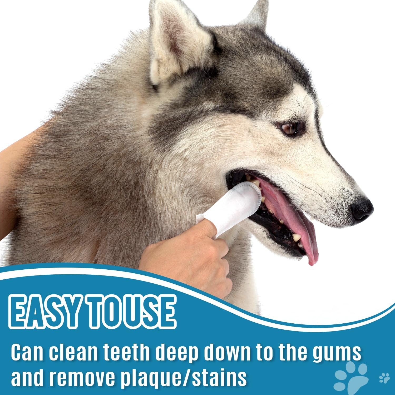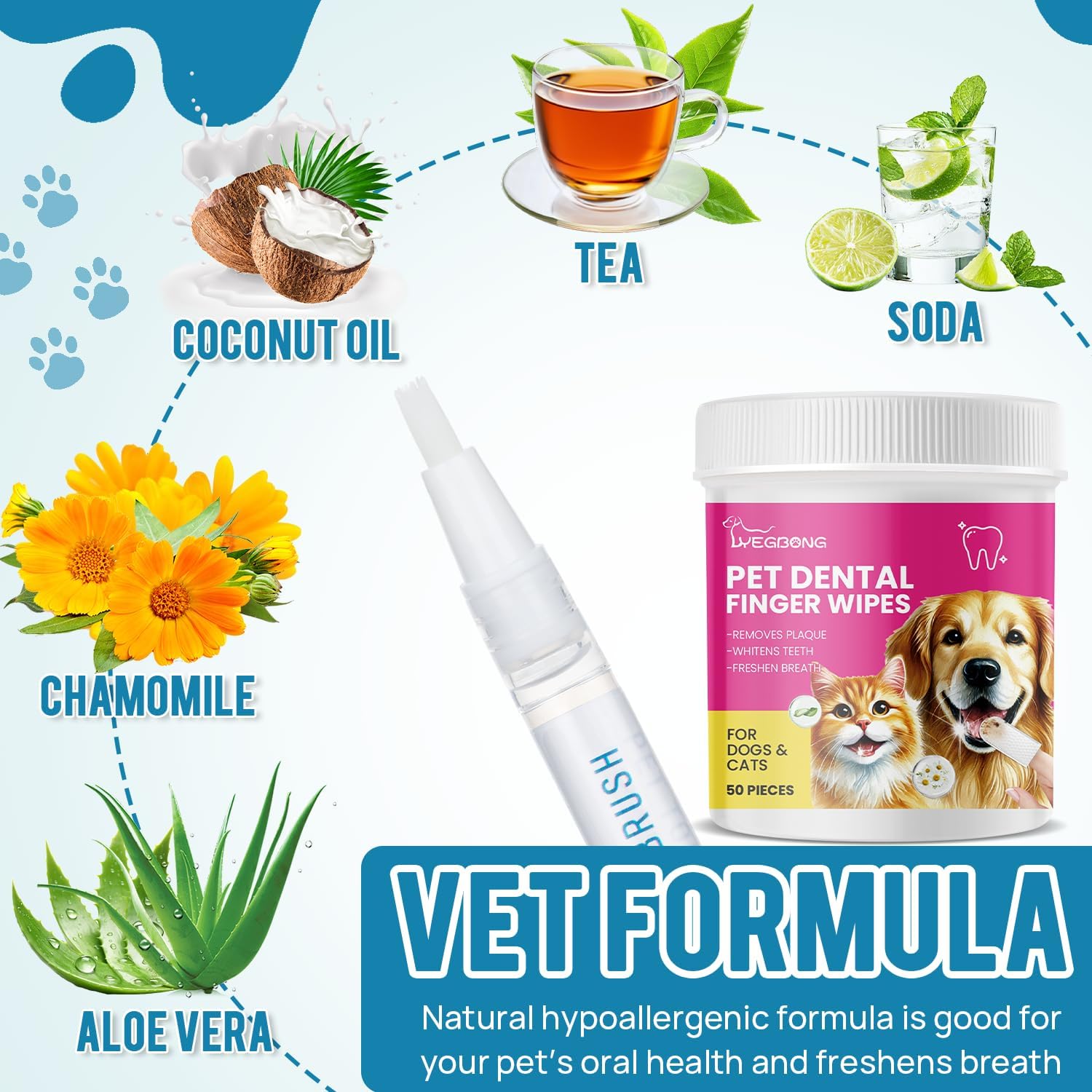 Dog Tooth Cleaning Kit – Dental Care Finger Wipes 50pcs & Toothbrush – Best Teeth Cleaning for Dogs, Puppies, Cats – Plaque Reduces, Freshens Breath, Healthy Teeth & Gums