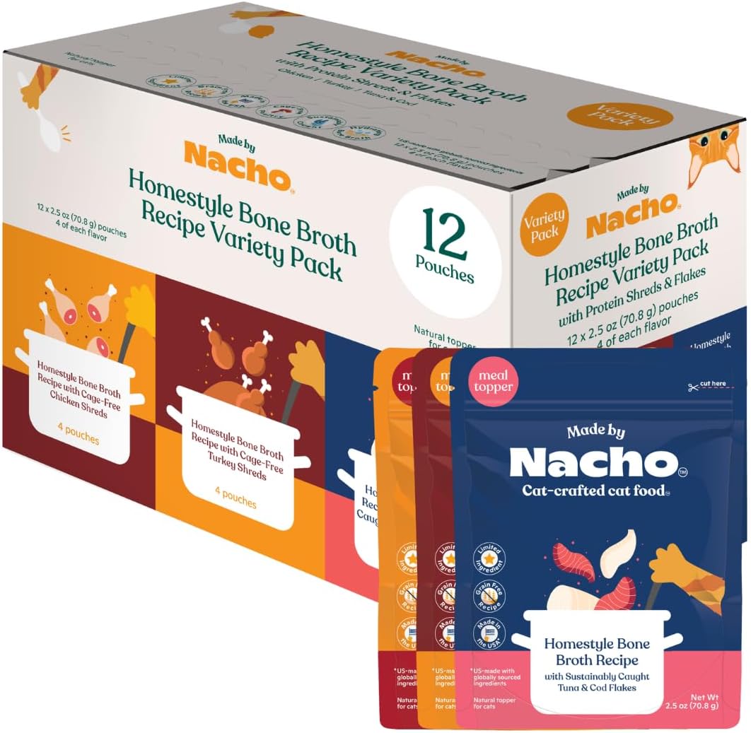 Made by Nacho Wet Cat Food Homestyle Bone Broth Variety Pack Hydrating Food Topper, Chicken (x4), Turkey (x4), and Tuna and Cod Flakes (x4) Limited Ingredients, 2.5oz (12 pouches)