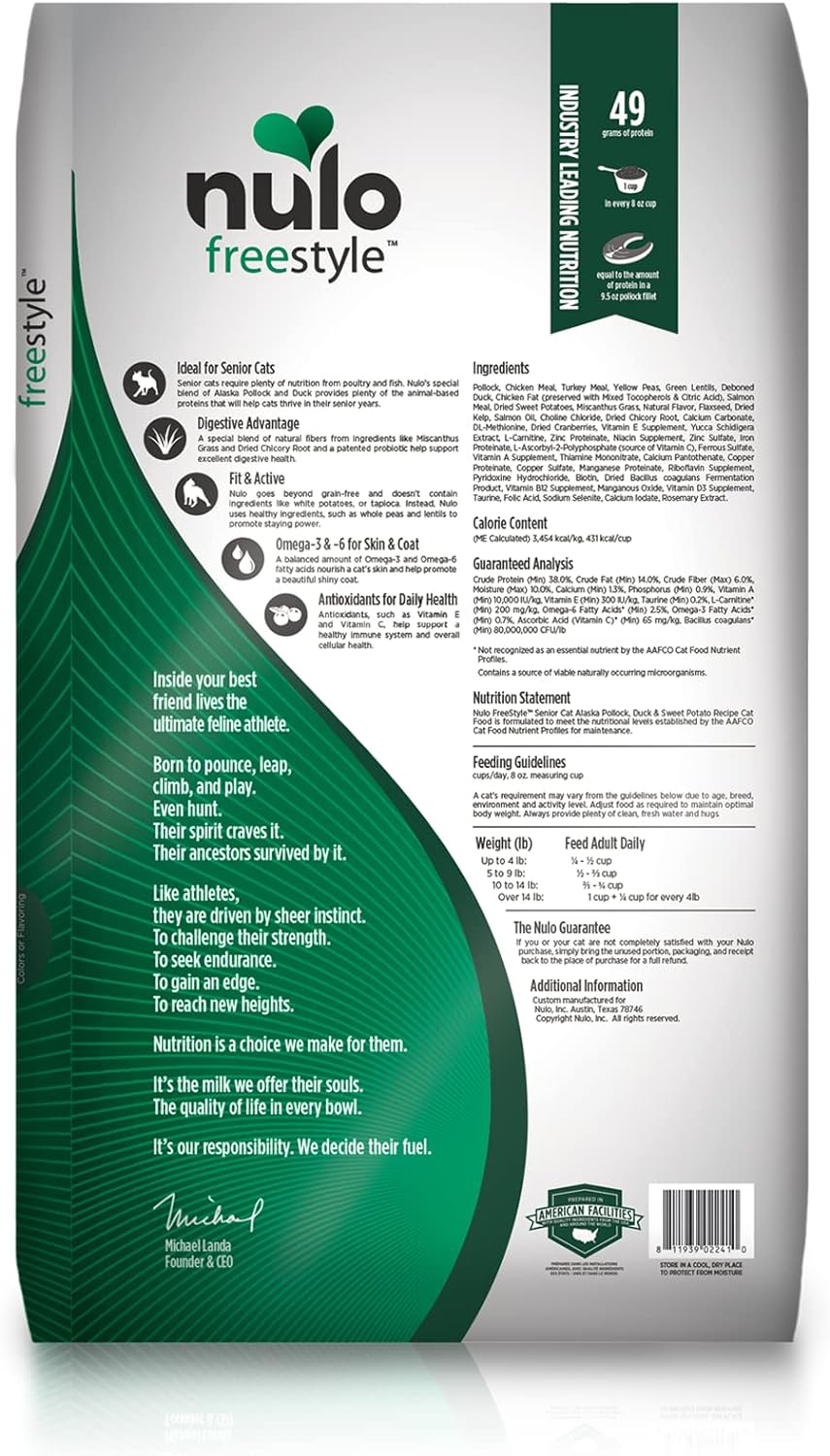 ALASKA POLLOCK, DUCK, & SWEET POTATO RECIPE – Nulo Freestyle Senior Dry Cat Food helps your cat thrive in their senior years with animal-based proteins, antioxidants, & grain-free ingredients; 4 lb bag.