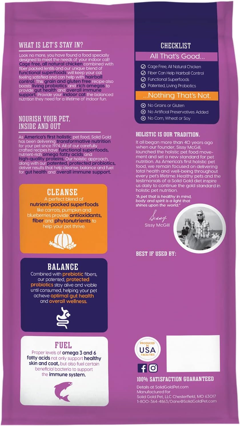 Solid Gold Indoor Dry Cat Food – Let’s Stay in Cat Food Dry Kibble for Indoor Cats – Hairball & Sensitive Stomach – Grain & Gluten Free – Probiotics & Fiber for Digestive Health – Chicken – 3lb
