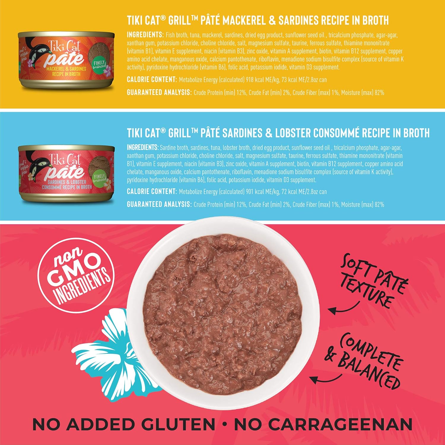 The ultimate feast for your feline! Tiki Cat Grill pates offer the high-protein, high-moisture nutrition cats need as carnivores. Real, flaked sardines, tuna and savory sardine broth are mixed and minced to perfection in the soft pate form cats love. All ingredients are 100% non-GMO, with no fruits or vegetables, grains, artificial colors, flavors or preservatives.