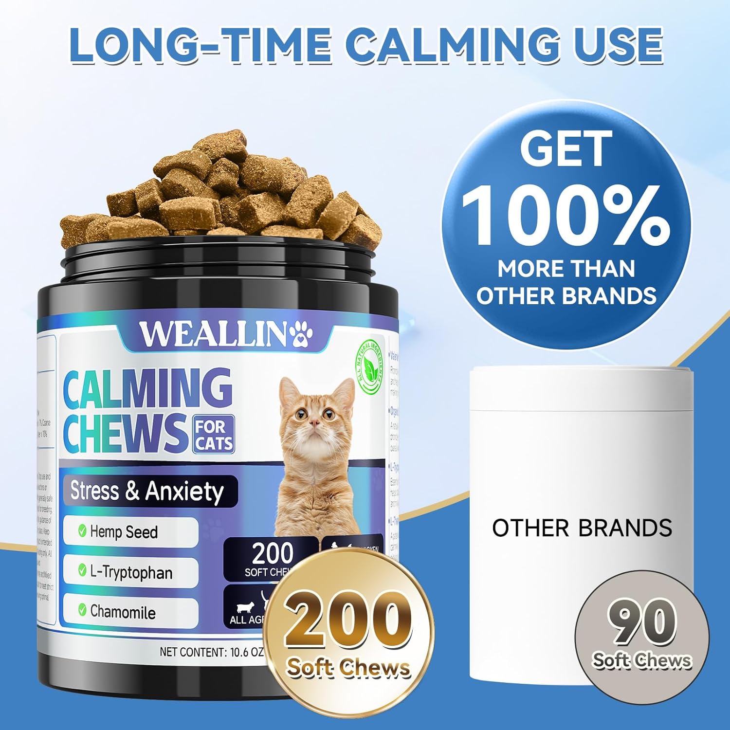 Adjustable & Cost-Effective for All Cats: With 200 chews per package, these dog anxiety relief treats are suitable for cats of all sizes and breeds, from kitties to seniors. The dosage can be adjusted based on your cat’s specific needs, making this an economical choice for long-term use. For cats with severe anxiety, consult a veterinarian before regular use to determine the best approach.