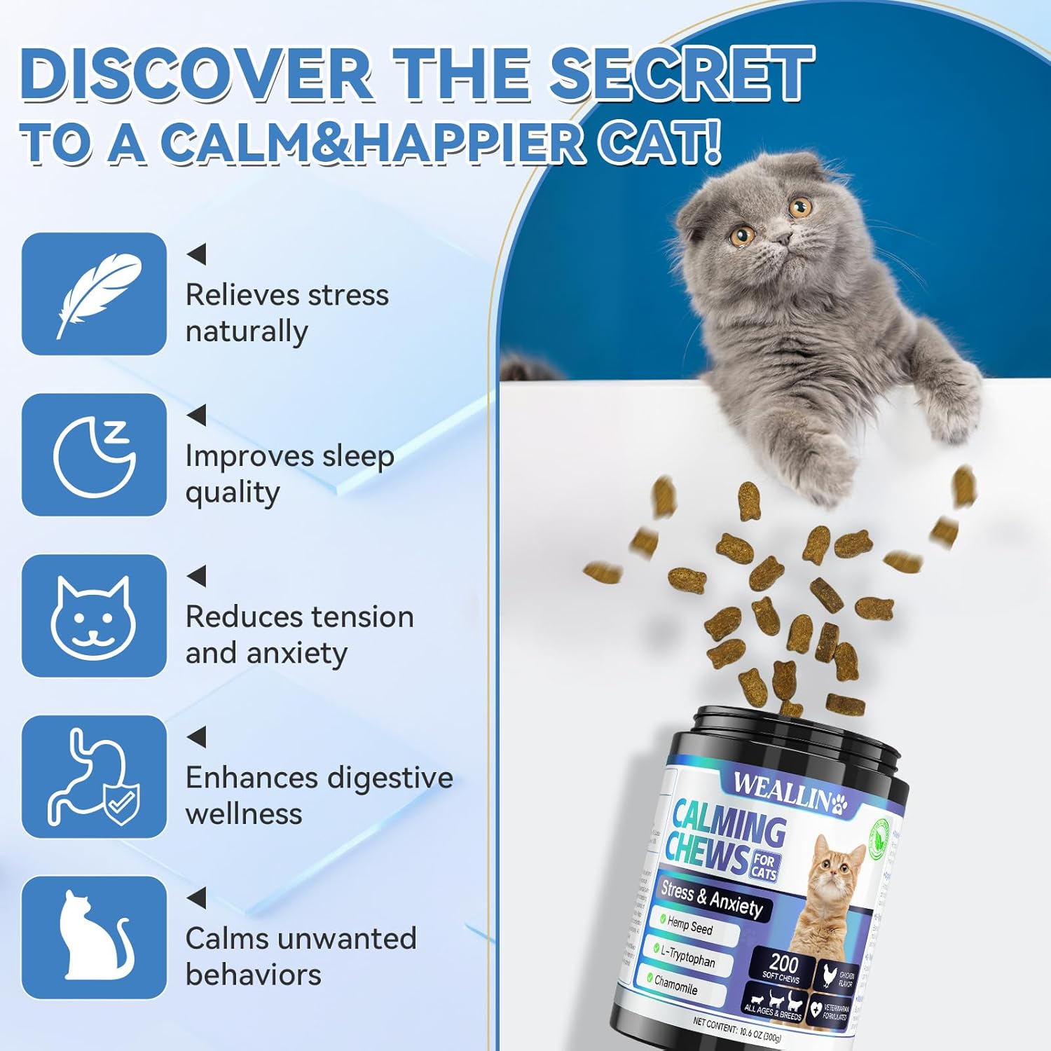 Soothe Anxiety and Relieve Stress: These cat calming treats are specially designed to help reduce common anxiety and stress-related behaviors, such as scratching, spraying, biting, or shivering caused by changes in the environment, travel, or vet visits. With a gentle formula, they keep your cat calm and promote a more peaceful lifestyle.