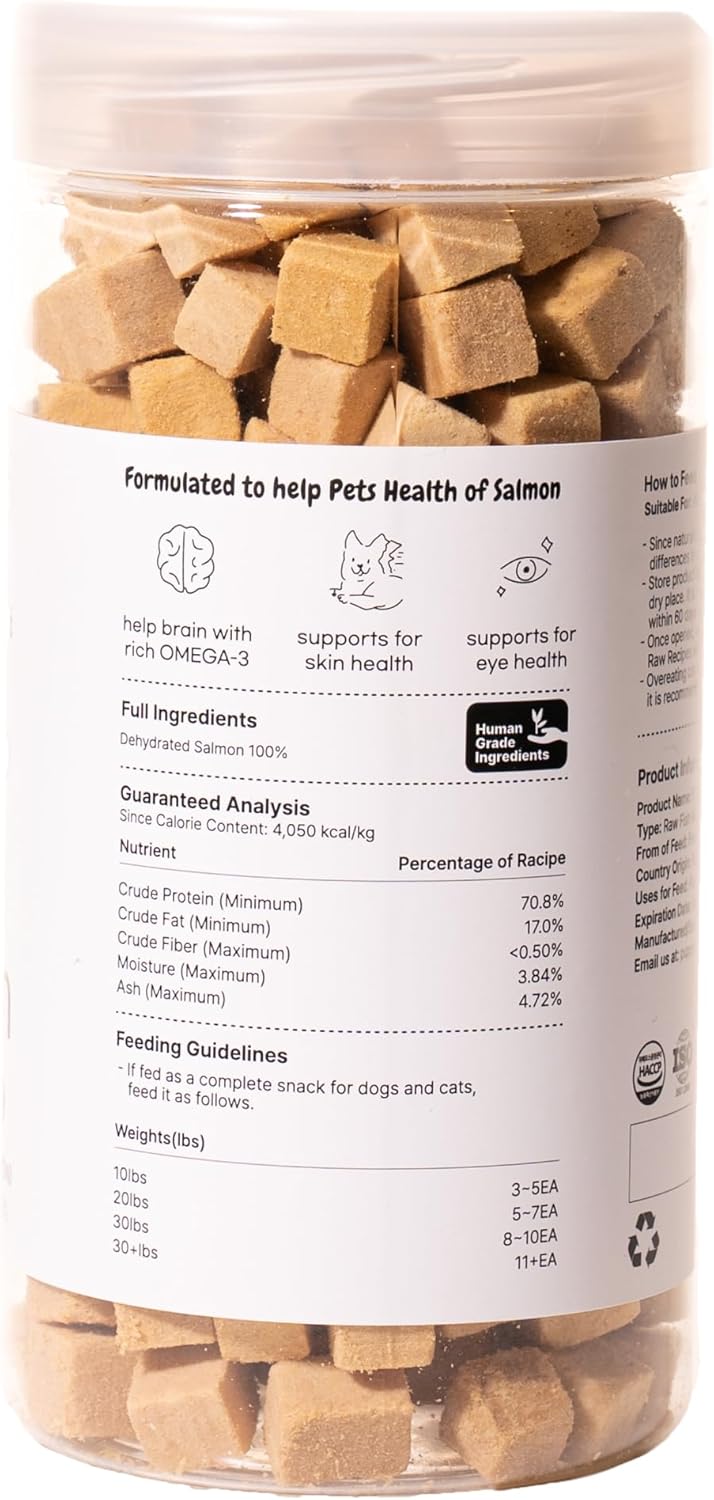 OMEGA-3 RICH SALMON CUBES: Salmon cubes are rich in naturally derived salmon oil for dogs and cats. It guarantees glossy fur, smooth skin, and enhanced brain function, packed with essential dog vitamins for eye health.