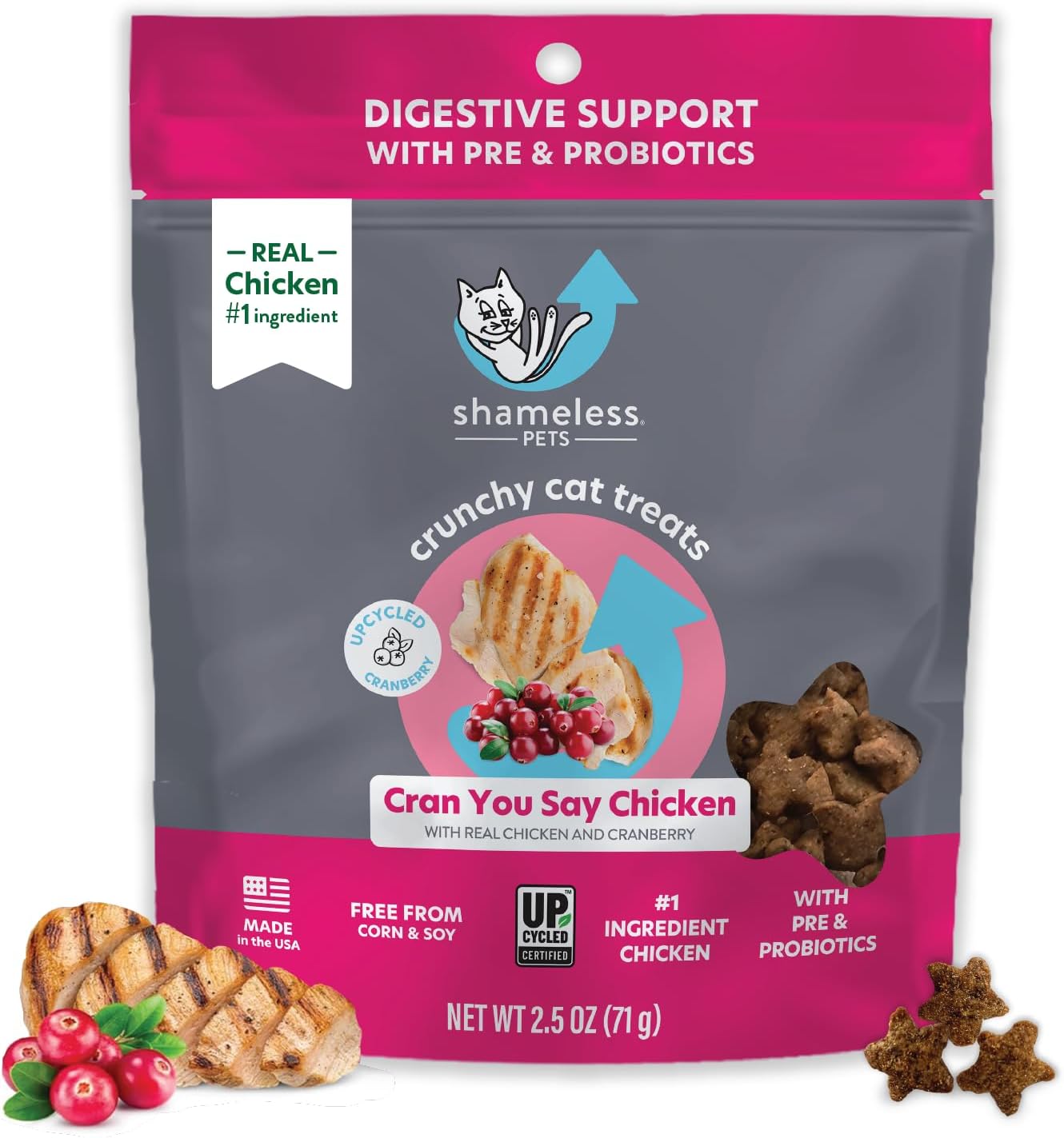 Shameless Pets Crunchy Cat Treats – Kitty Treats for Cats with Digestive Support, Natural Kitten Treats with Real Chicken, Healthy Flavored Feline Snacks – Cran You Say Chicken, 1-Pk