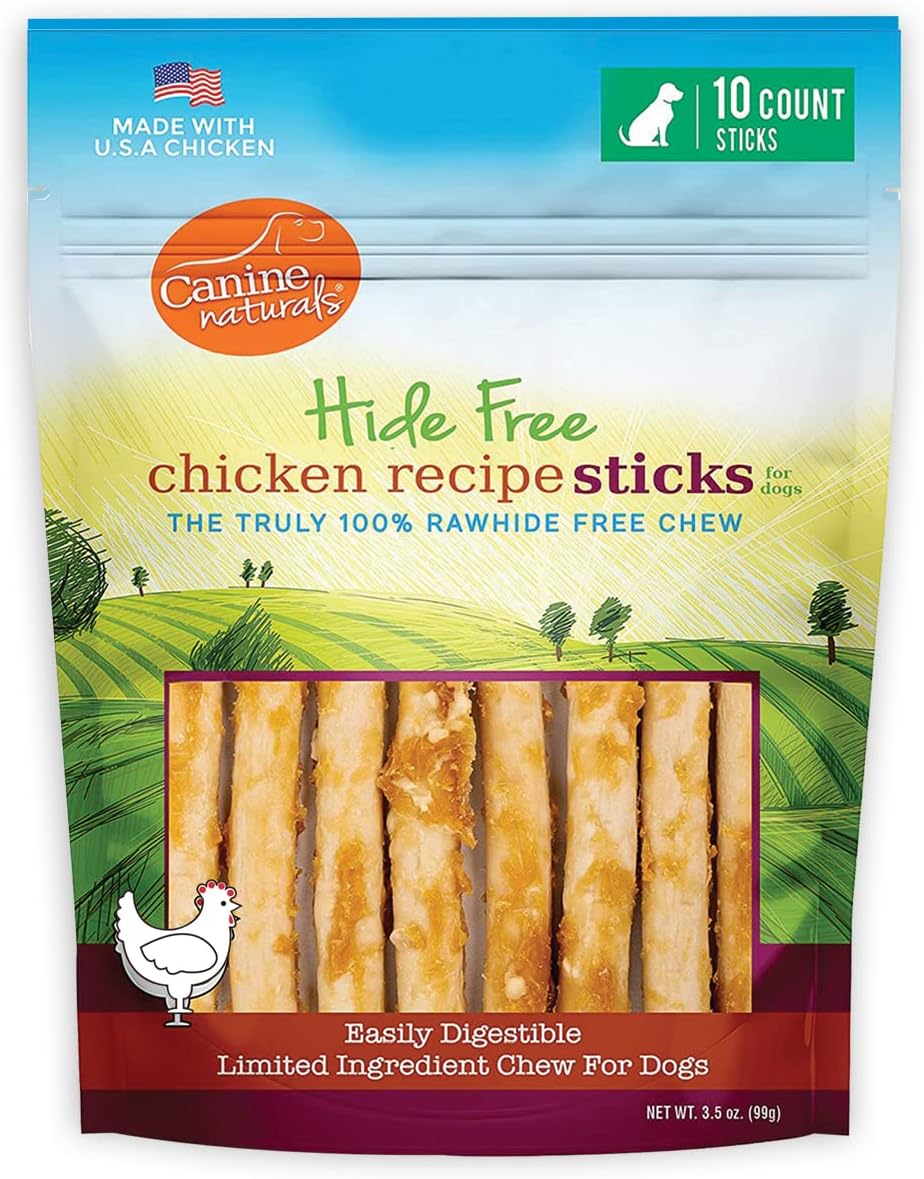 Canine NaturalsⓇ Hide Free Chews are a healthy and delicious alternative to rawhide products. Some brands or product names imply their chews are hide-free, when in fact “collagen” derived from rawhide or some form of animal hide is used in their process. Why? Because animal hide provides a longer chew time for a lower cost as a by-product of other production, which can be difficult for your dog to digest. We proudly state 100% Rawhide Free directly on our packaging. With the 10 pack of our 5”chicken chew sticks they’ll still enjoy plenty of healthy, safe, and satisfying chew time.** Our limited ingredient recipe is lab proven to be up to 400% more digestible than rawhide based products.* Because we use whole muscle meat and not chicken parts, your dog will enjoy delicious chicken raised and sourced right here in the USA. Made with care and integrity; our healthy chews contain zero artificial flavors, colors, or filler ingredients like corn, wheat, or soy. More than just a tasty treat, the long-lasting chew helps clean your dog’s teeth and gums while satisfying their natural chewing instinct, giving your pet the satisfaction and flavor that rawhides can’t! With great flavors and real ingredients, Canine NaturalsⓇ chews are a healthy and rewarding treat that’s sure to please. *In Vitro Hide Free Study Performed by Dr. Maria Godoy at the University of Illinois. **We recommend buying a chew that is larger than your dog’s mouth. A chew that is larger than your dog’s mouth helps ensure they chew and work on the product versus just swallowing it.