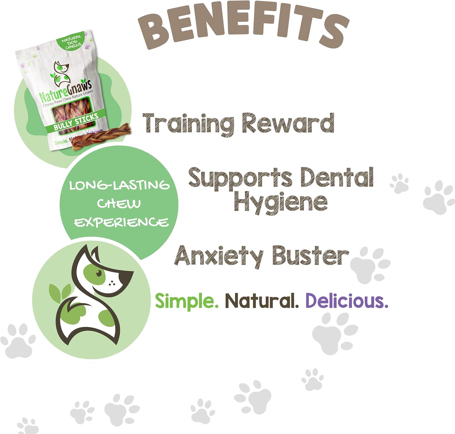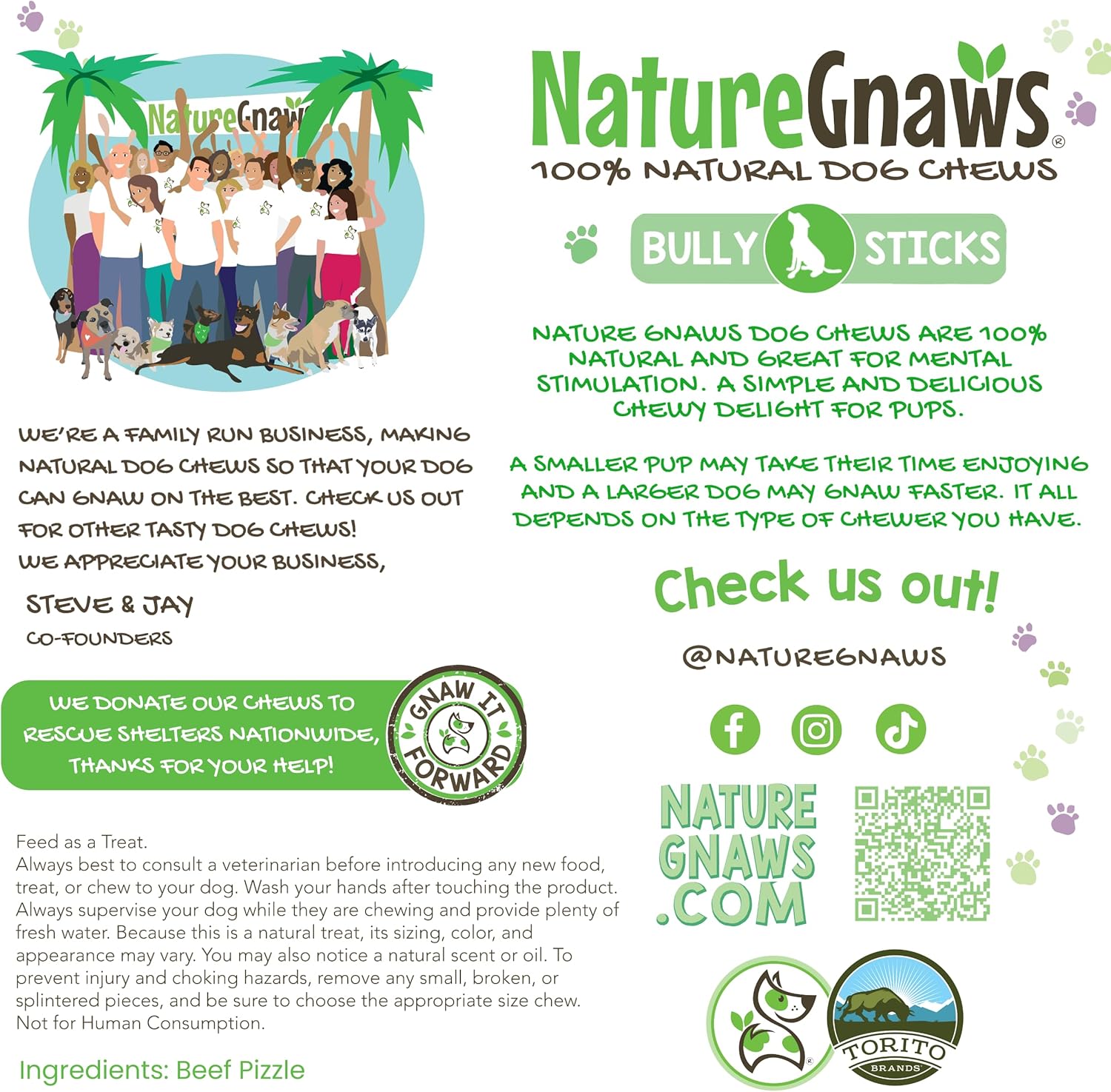 Made with natural premium quality beef pizzle, our Braided Beef Bully Sticks are ideal to keep your beloved pup busy and calm. These natural chews are perfect for teething puppies, aggressive chewers, medium and large dogs. Nature Gnaws Beef Bully Braids are low-odor, grain-free and gluten-free, making them the perfect natural alternative to rawhide bones and manufactured dental chews. Savory snack, the natural act of chewing helps reduce plaque and tartar for cleaner teeth and fresher breath. Promoting overall good dental hygiene, these bully chews are an excellent choice for your pet. Our Beef Chews have a savory thick texture that is the perfect reward to occupy and entertain. Your dog will love the natural scent and tasty beef flavor of our chews. As a family-run business, we are dedicated to providing 100% natural dog chews, bones and treats made with responsibly sourced ingredients to ensure they are the best simple, natural, and delicious products for your beloved pups.