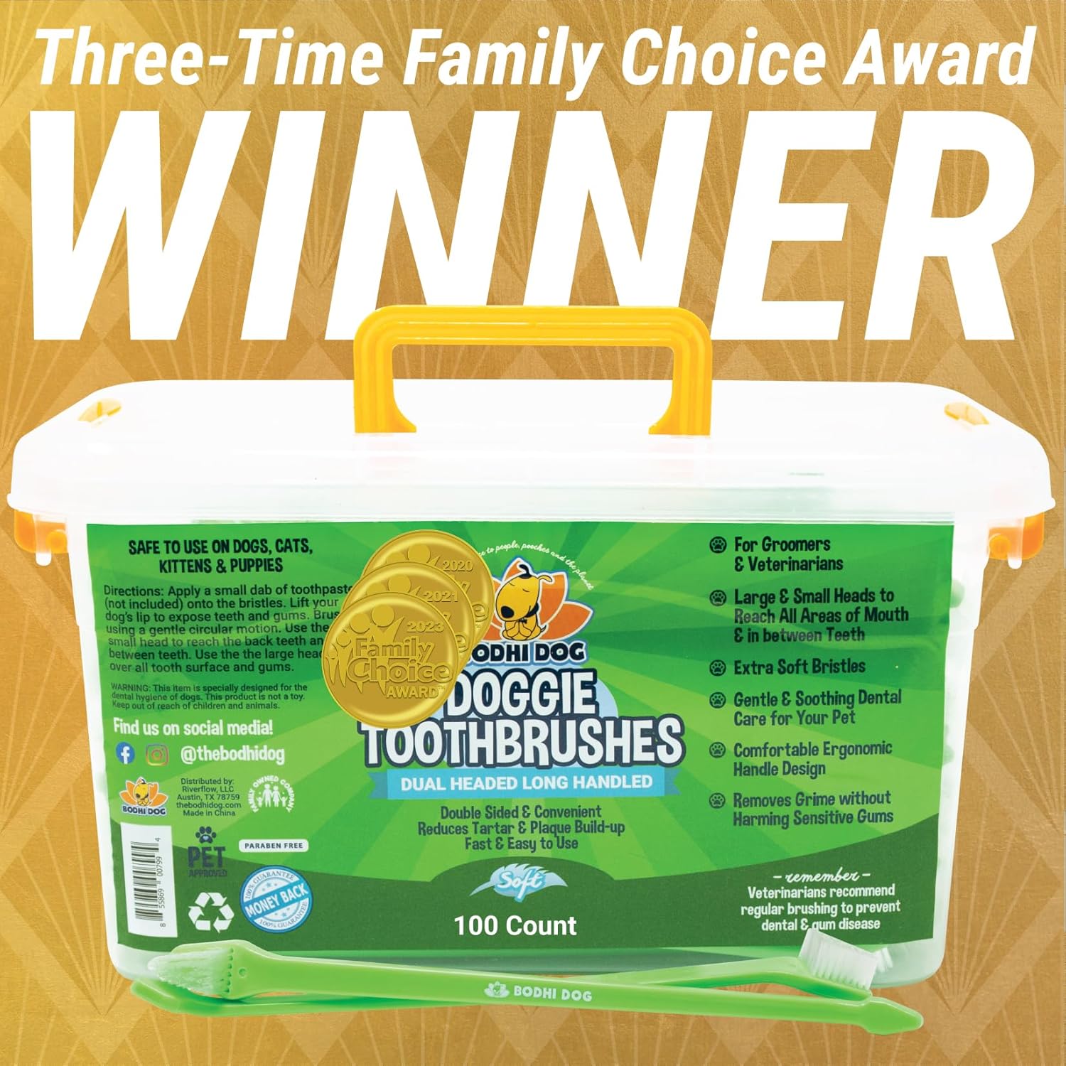We are a small family owned business of pet lovers committed to you and your furry friend’s happiness! Based out of Austin, Texas, every product we make is designed to bring harmony between people and their pets. We think you will find our Bodhi Dog Toothbrushes are no exception. If you don’t love our doggie toothbrushes, let us know and receive a full, no questions asked refund.