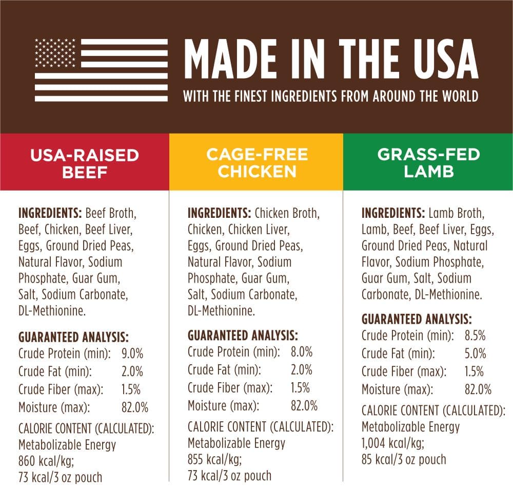NATURAL WET DOG FOOD TOPPERS WITH SAVORY GRAVY: Made with cuts of USA raised beef, cage free chicken or grass fed lamb in savory gravy. Made without grain, potato, corn, wheat, soy, carrageenan, artificial colors or preservatives.