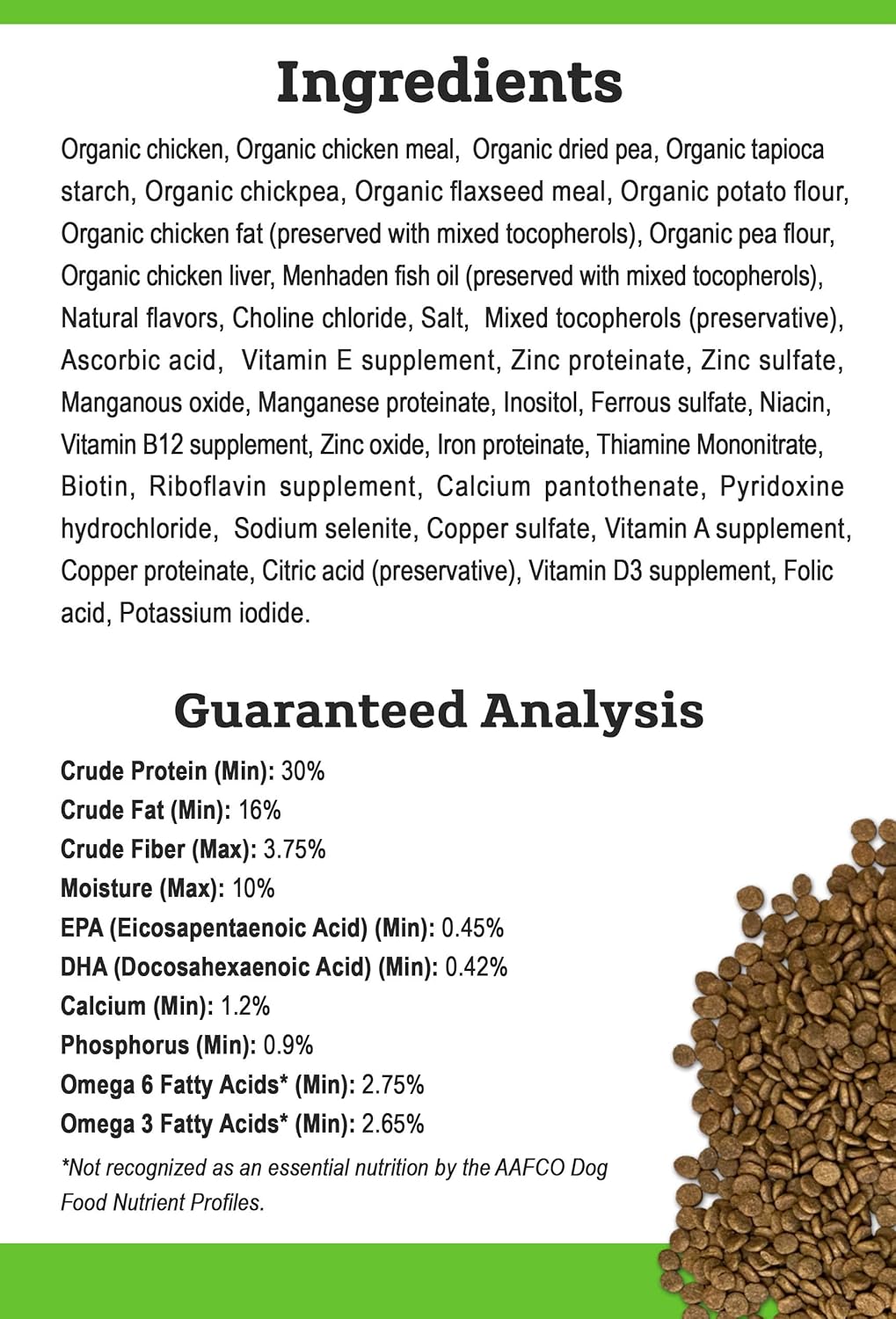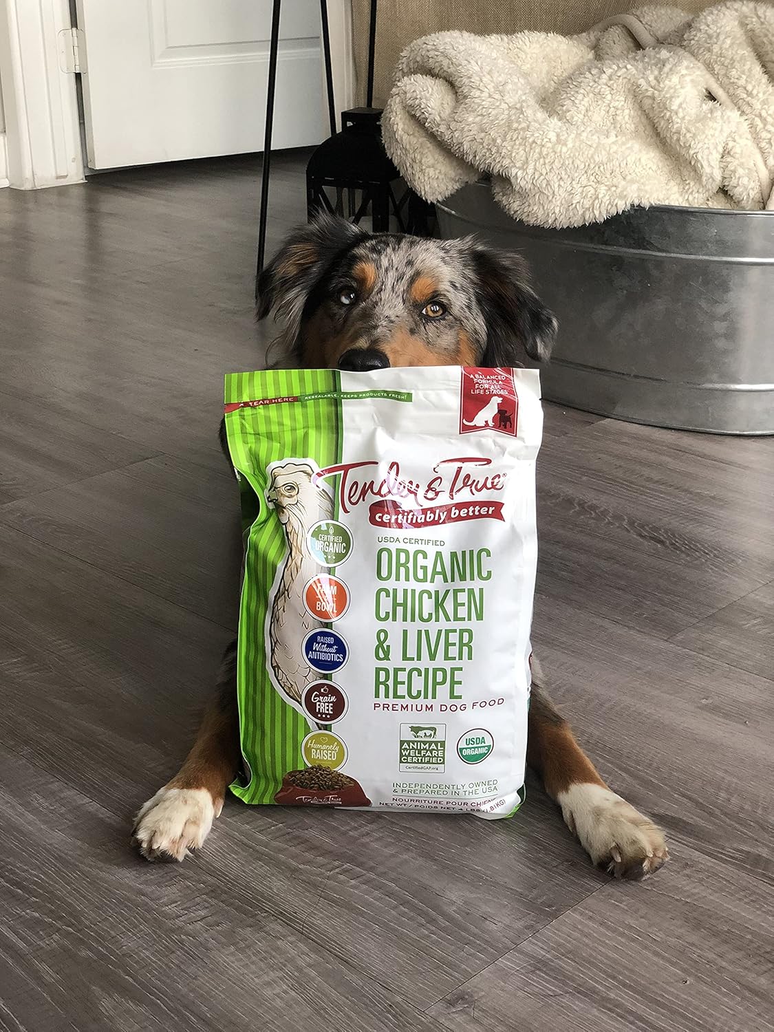 We start with organic humanely raised chicken as the #1 ingredient. Our recipes are made with a precise blend of organic ingredients, antioxidants, vitamins and minerals expressly blended for optimal nutrition. No corn, wheat or soy is added to our recipes. Additionally, no artificial preservatives, colors or flavors are included in our premium pet food. Formulated by our pet food nutritionists, Tender & True Organic Premium Chicken & Liver Recipe dog food is formulated specifically for all dogs throughout All Life Stages, except for growth of large size dogs, 70 lbs or more as an adult.