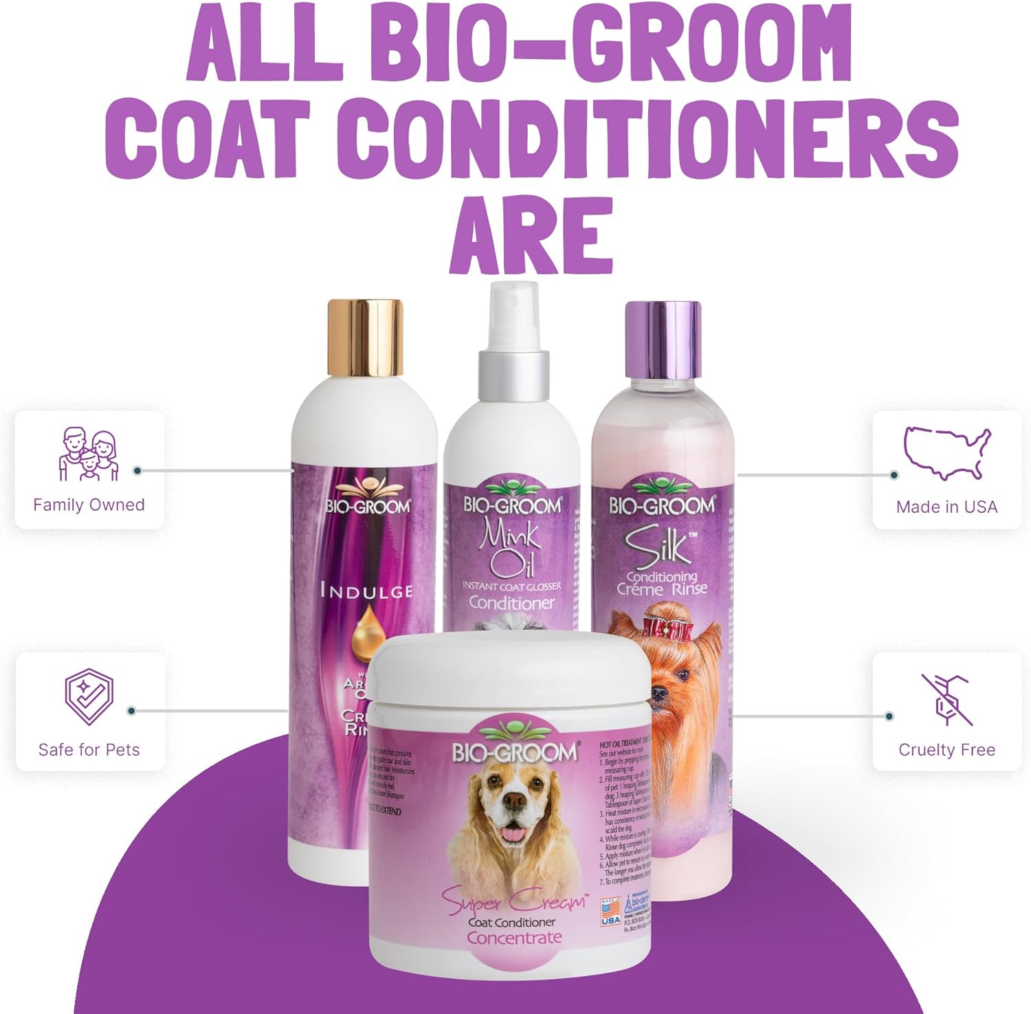 White coats sparkle without bleaching when shampooed with this extraordinary formula that has been developed for white and other light colored coats. Bio-Groom Super White Brightener Shampoo is Fortified with Protein, it cleans thoroughly while adding life and body to the coat. Super White controls matting, tangling, and fly-away hair. It’s rich lather rinses out easily, leaving the hair smooth, manageable, shiny, and with a fresh clean smell. It is rich and foamy with neutral pH. Concentrated 8:1.Show off an unforgettable shiny and smooth coat with Bio-Groom Silk Conditioning Creme Rinse. It is fortified with CHAMOMILE, nature’s own stimulating hair and skin conditioner, and leaves hair looking and feeling it’s best. Silk provides beautiful body, fullness, resiliency, and texture to the coat. It moisturizes overworked hair, removes tangles, and rinses out clean, making hair easy to manage. Silk is designed for use on all coat colors, including white. It is anti-static, pH balanced, biodegradable, and fresh smelling. Dilutes: 4 to 1.Safe for dogs and cats over 12 weeks old. Safe to Use with Topical Flea and Tick Treatments. Recommended by Top Breeders and Professional Groomers Worldwide. Cruelty Free, Biodegradable, and Made in USA.