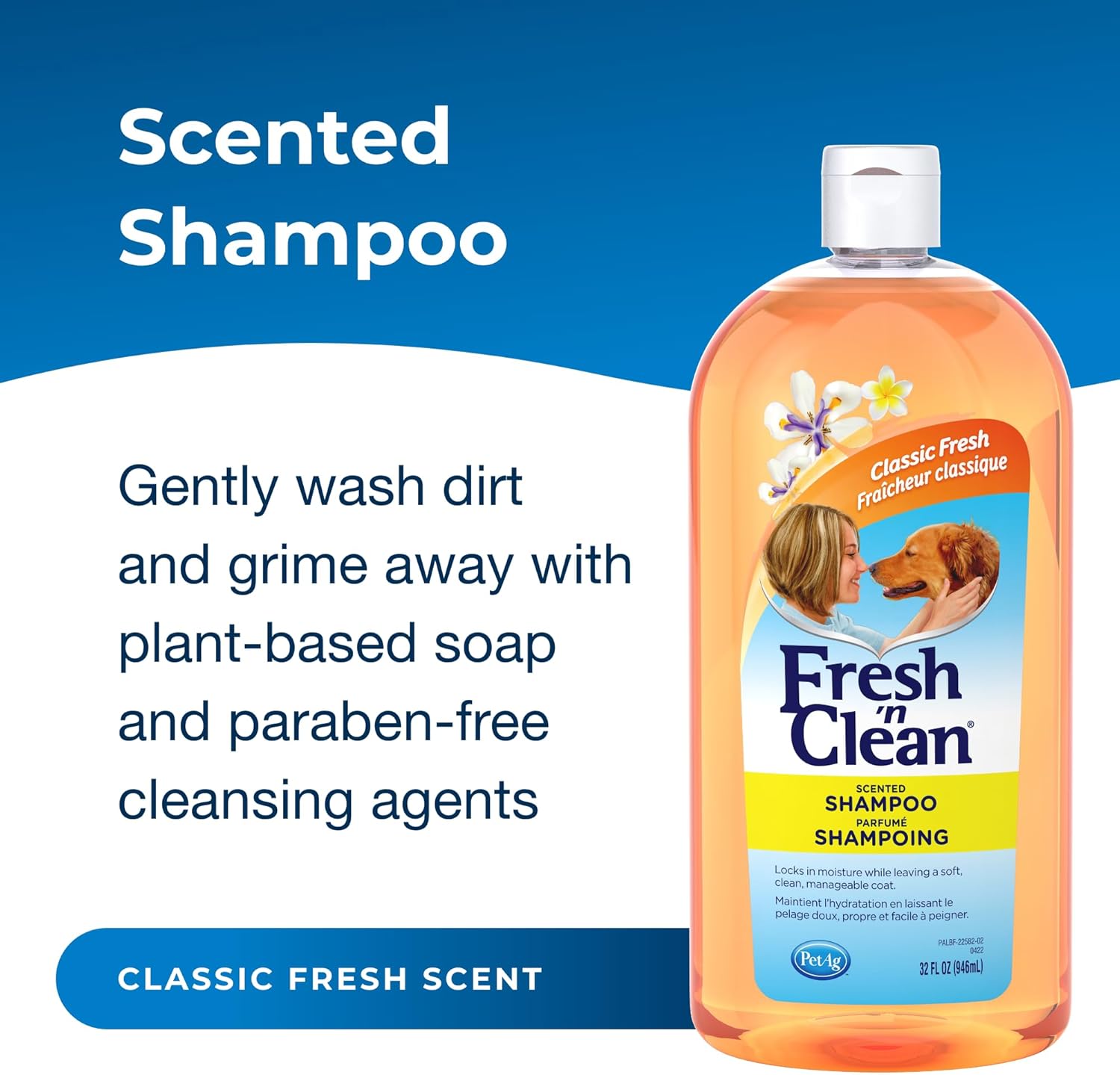 PetAg Fresh ’n Clean Scented Shampoo, Classic Fresh Scent – 32 oz – Moisturizes with Vitamin E & Aloe Vera – Strengthens & Repairs Coats – Soap Free