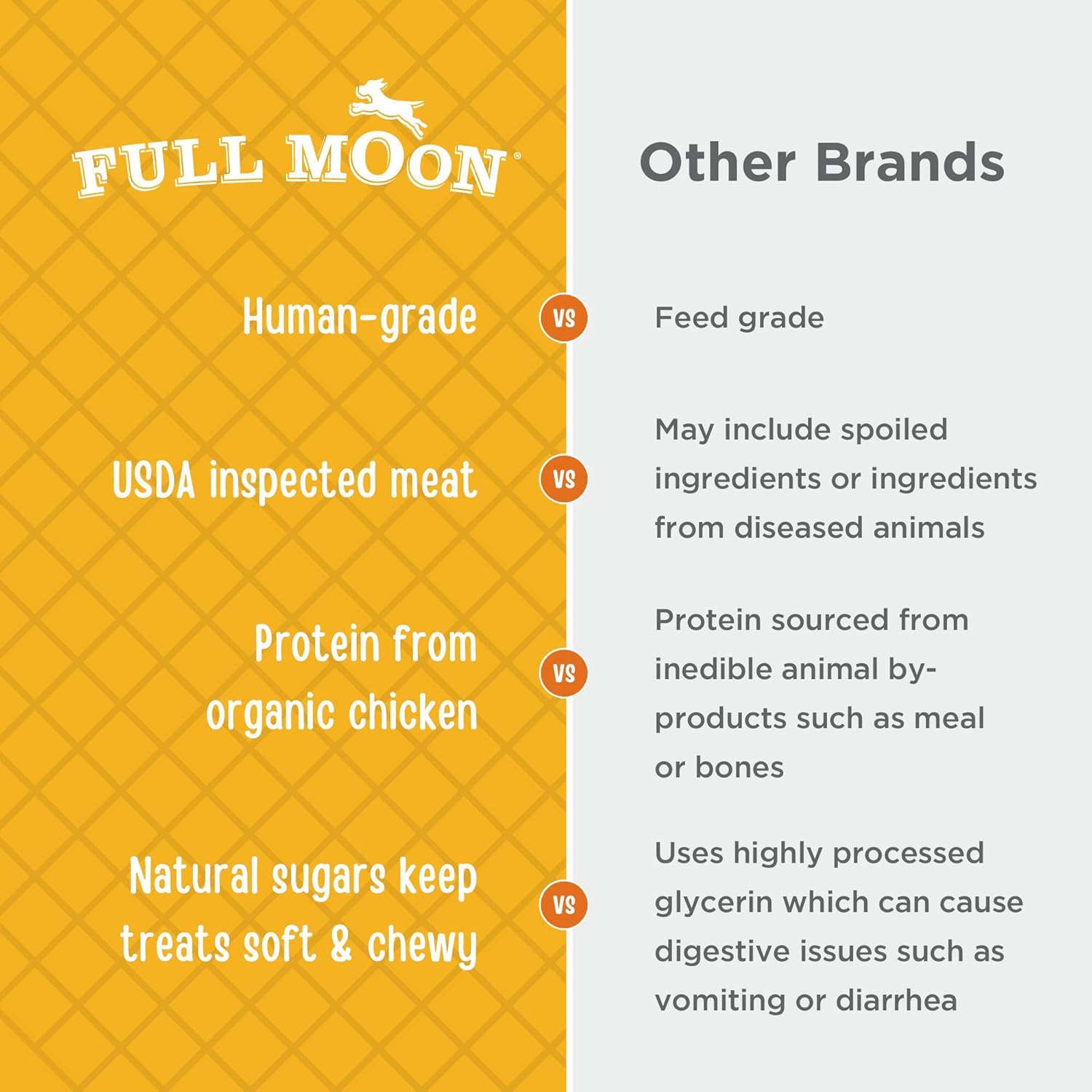 U.S.-GROWN CHICKEN: Full Moon treats are proudly made in the United States using regionally sourced ingredients, including USDA approved, antibiotic-free chicken.