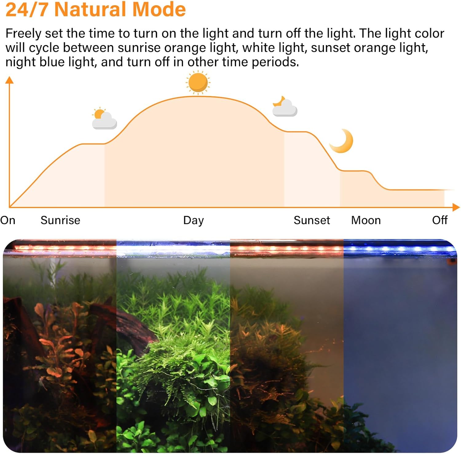 ★[Simulating 24/7 Natural Light Cycle]: Our aquarium lights astonishingly somulate the day-to-night cycle of natural light. It opens or closes slowly over 15 minutes, thus preventing light shock to the fish. From the warm morning sunlight to the rich spectrum at noon, to the soft blue light in the evening, it will make your aquarium look more mysterious and beautiful
