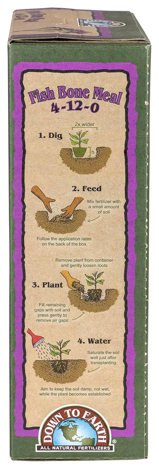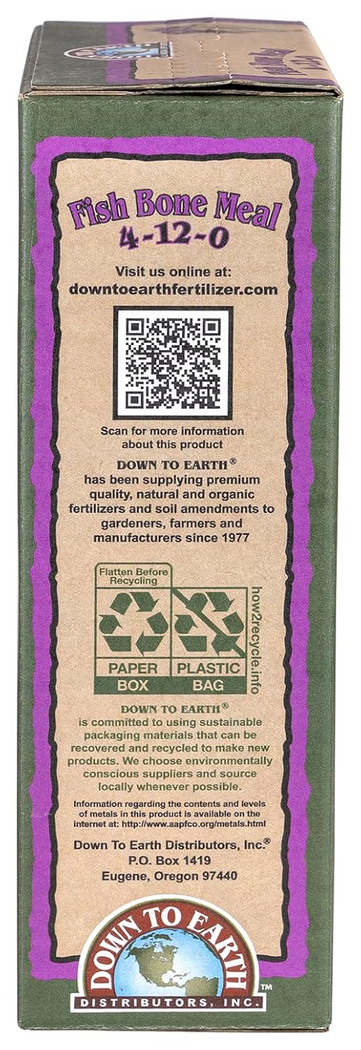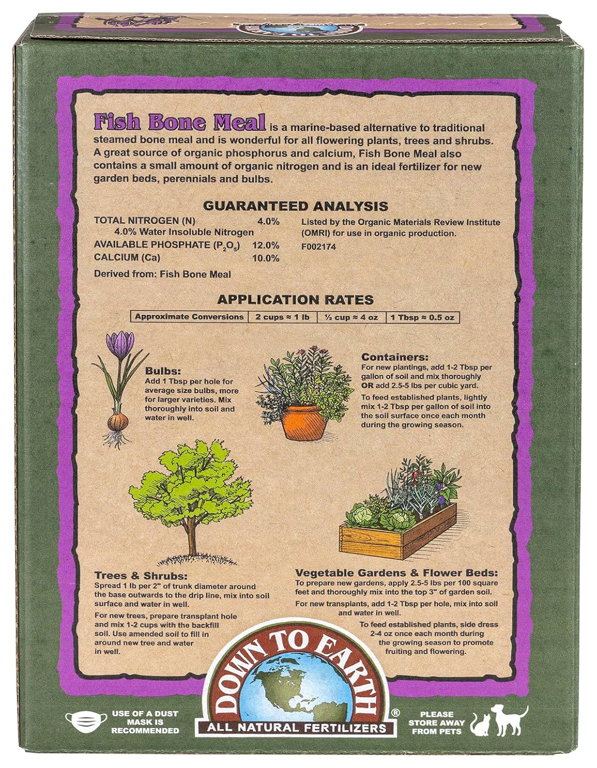 Down To Earth Fish Bone Meal is a five pound box of all natural fertilizer with 4-12-0 formula and is listed by the Organic Materials Review Institute (OMRI) for use in organic production
