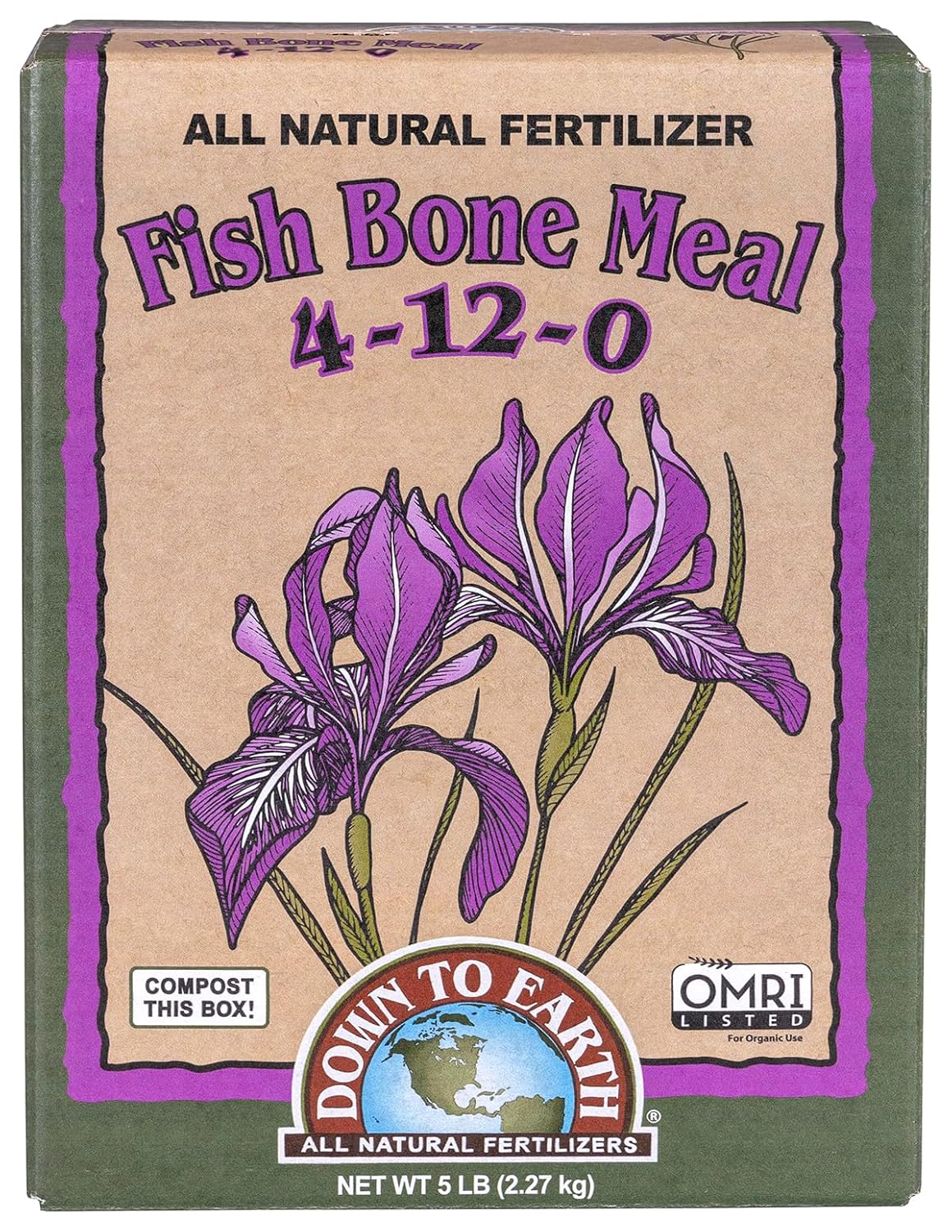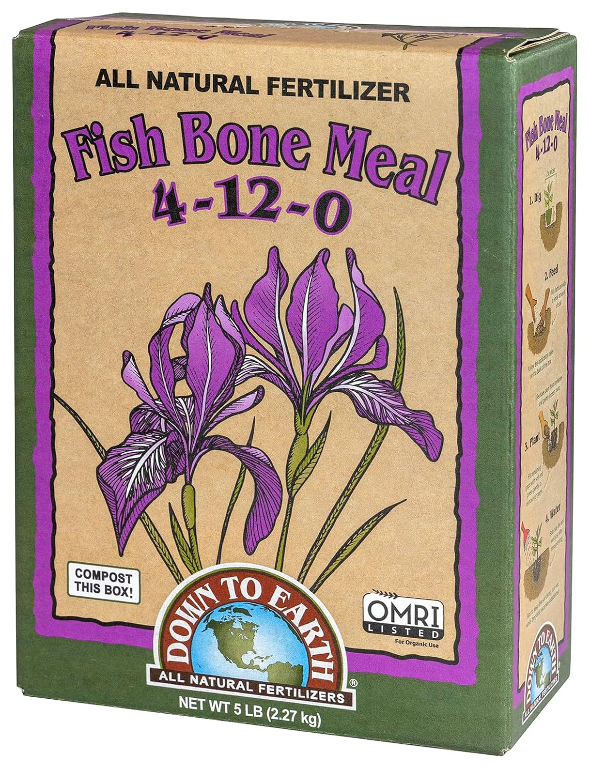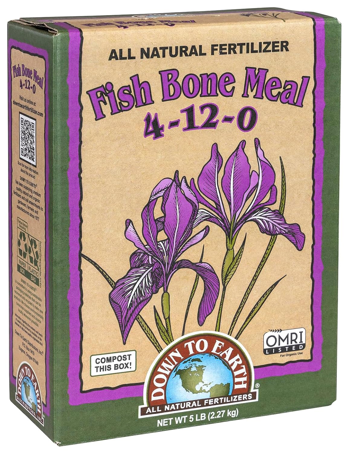 Down To Earth Fish Bone Meal is a five pound box of all natural fertilizer with 4-12-0 formula and is listed by the Organic Materials Review Institute (OMRI) for use in organic production