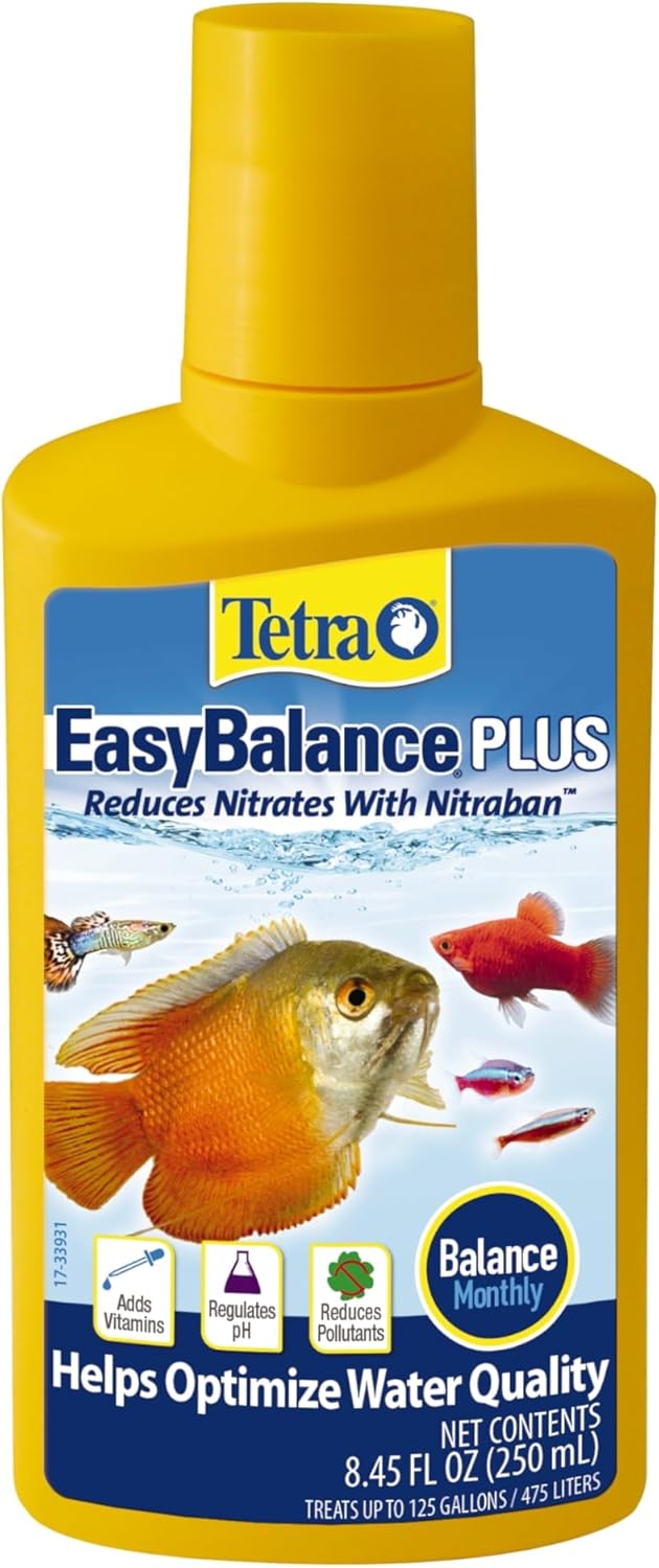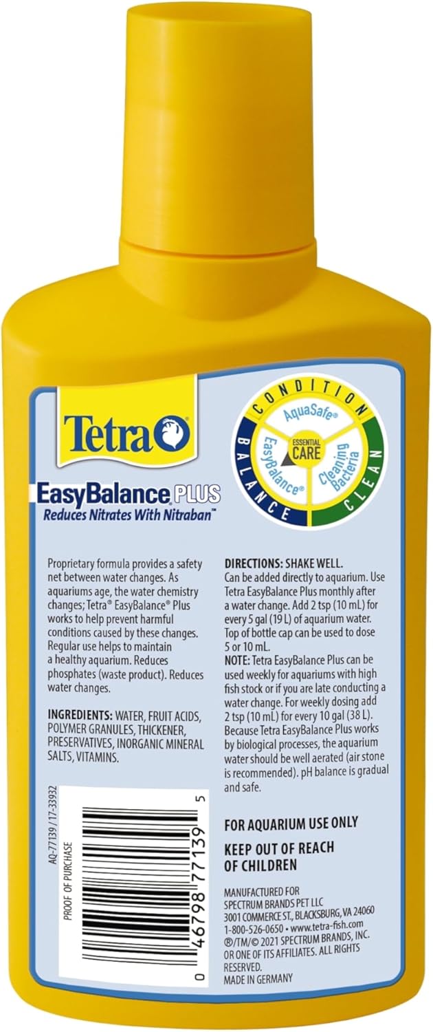 Tetra® EasyBalance® Plus works to maintain healthy levels of essential aquarium water chemistry necessary to keep your fish happy and healthy. This easy-to-use formula regulates pH and alkalinity and reduces nitrates and phosphates. At the same time, Tetra EasyBalance Plus replenishes essential vitamins, minerals and electrolytes for maximum aquarium health. One teaspoon treats 5 gallons of aquarium water. Regular use of EasyBalance Plus reduces the need for water changes for up to 6 months. Use EasyBalance Plus weekly to maintain healthy aquarium conditions. Shake well before using. The top of the supplied screw cap can be used for measuring. Fill to inner ring line (5 mL or 1 teaspoon) to treat 5 gallons or use the full cap (10 mL) for 10 gallons. This product should not be used in aquariums with low oxygen conditions; proper aeration using an airstone is recommended. A properly maintained aquarium contains the correct stocking level of fish, aeration, proper filtration and regular testing. Since 1951, Tetra has developed the world’s most comprehensive body of fish food knowledge, and fishkeeping enthusiasts have looked to the brand for products and solutions that add ease and beauty to their home. Whether you’re an experienced hobbyist or just starting out, Tetra has everything you need–-from a large variety of quality fish food and innovative equipment to test kits and decor.