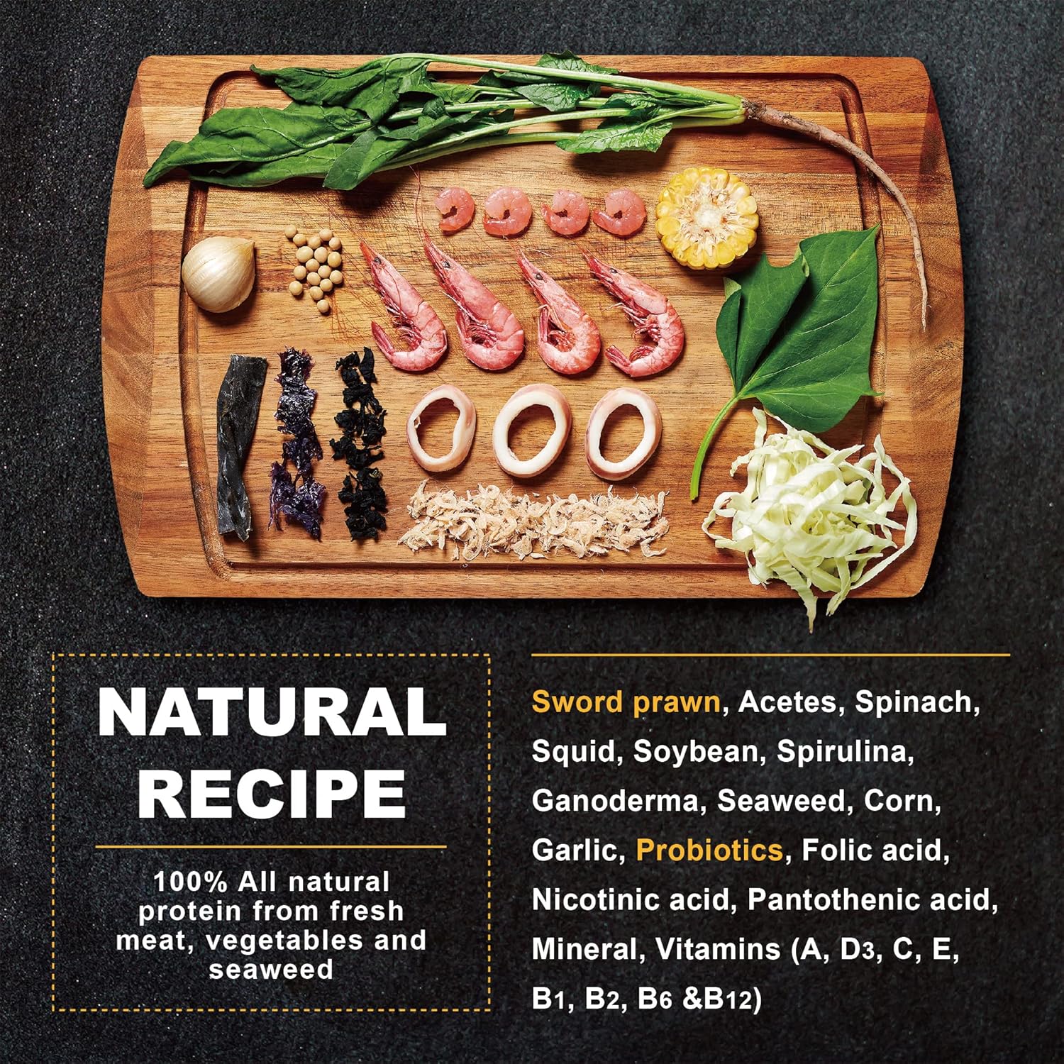 Superior Quality Ingredient : All natural protein from fresh meat, vegetables and seaweed. No additives, no artificial flavors or coloring, no byproducts and other harmful ingredients. Made from carefully selected ingredients like Sword prawns, akiami paste shrimps organic spinach, fresh squid, fresh-pick garlic, natural spirulina and seaweed