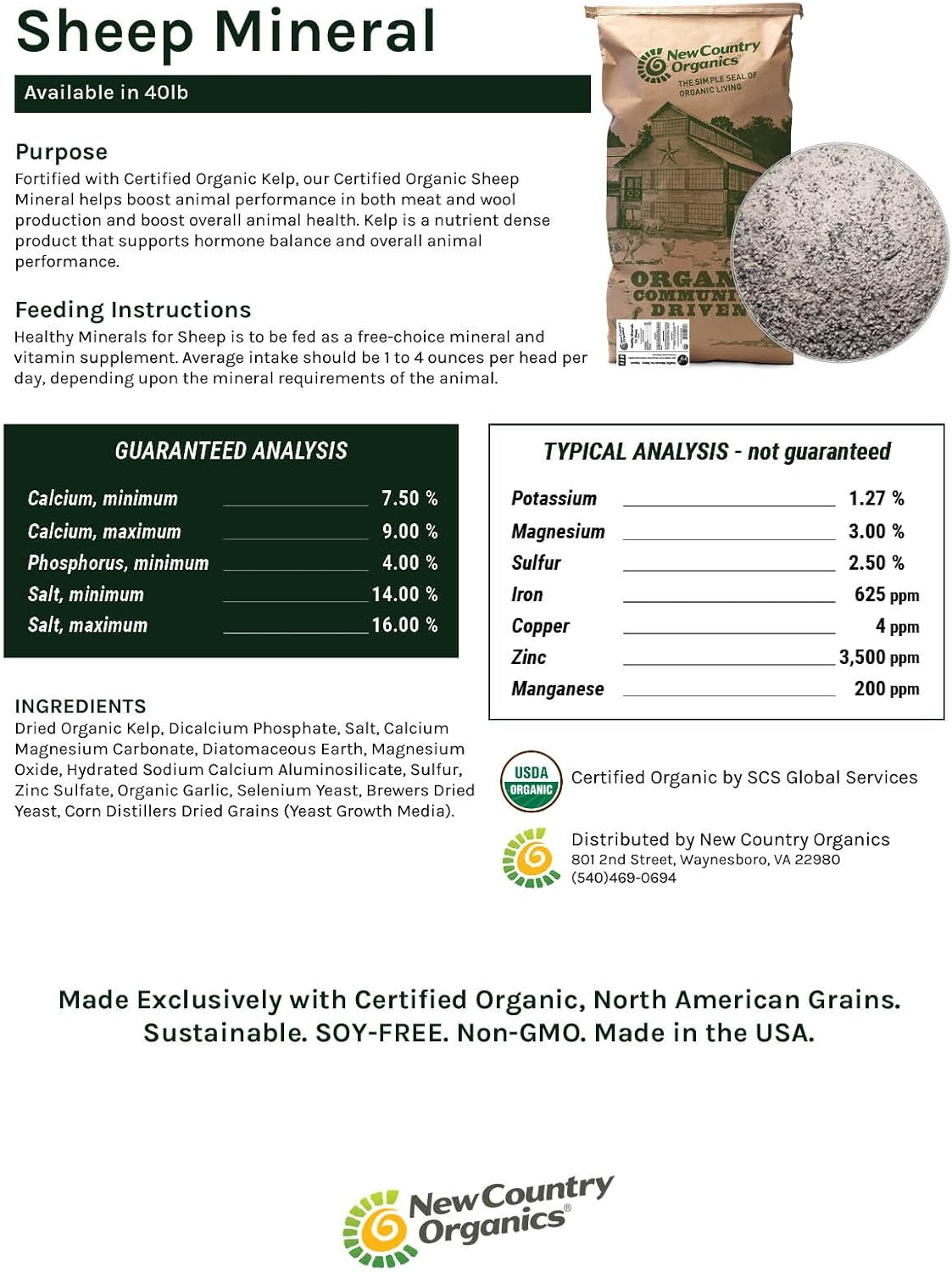 New Country Organics | Healthy Sheep Kelp Based Minerals for Sheep | Certified Organic and Non-GMO Sheep Feeder | 40 lbs