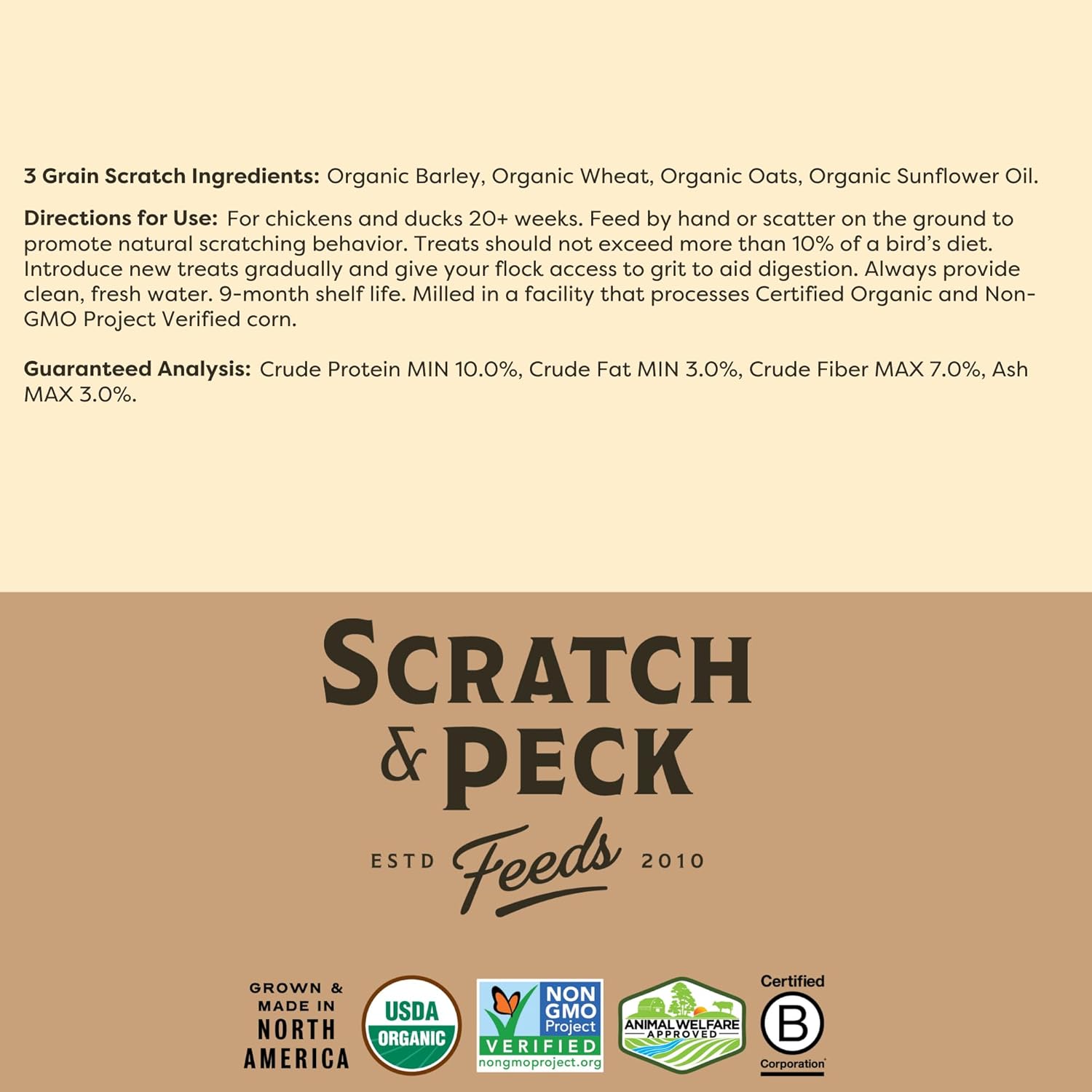 Scratch and Peck Naturally Free 3-Grain Scratch is Soy and Corn Free and made using Organic whole grains. We use a blend of Pacific Northwest grown Organic Whole Oats, Organic Whole Wheat and Organic Whole Barley from farms throughout the region. This product is intended as a supplemental treat to a complete diet feed. Feed as a treat from your hand or scatter on the ground! Always offer plenty of fresh water and the appropriate sized Grit!