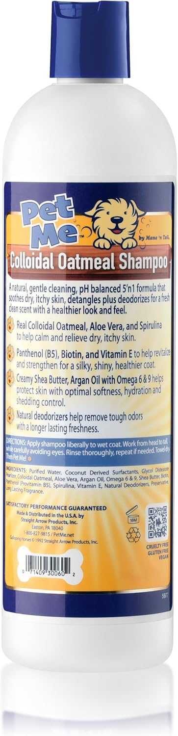 Pet Me Colloidal Oatmeal Shampoo is a natural, gentle cleaning, pH balanced 5 in 1 pet shampoo. It cleanses and soothes dry, itchy skin with colloidal oatmeal, aloe vera and spirulina. Detangles with panthenol and biotin to add moisture and strength to coat. Plus deodorizers help remove tough odors with a longer lasting freshness. Cruelty free, gluten free, and vegan.