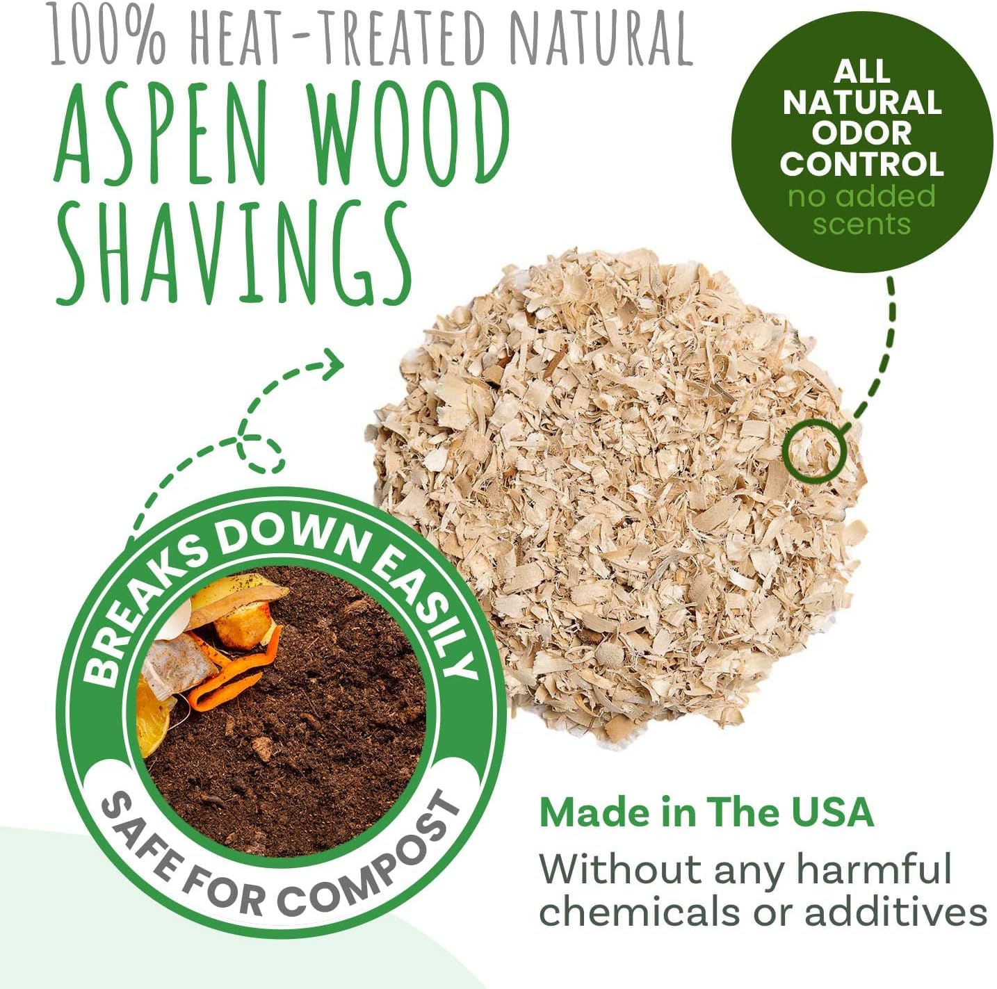 100% Heat-Dried All Natural Aspen Shavings: Made in the USA without any harmful dyes, chemicals or additives; Made from wood shavings directly off the tree – so no potentially dangerous fibers that may cause respiratory problems or other health issues; Breaks down easily and organically for safe disposal in your garden, compost, or organic waste bin