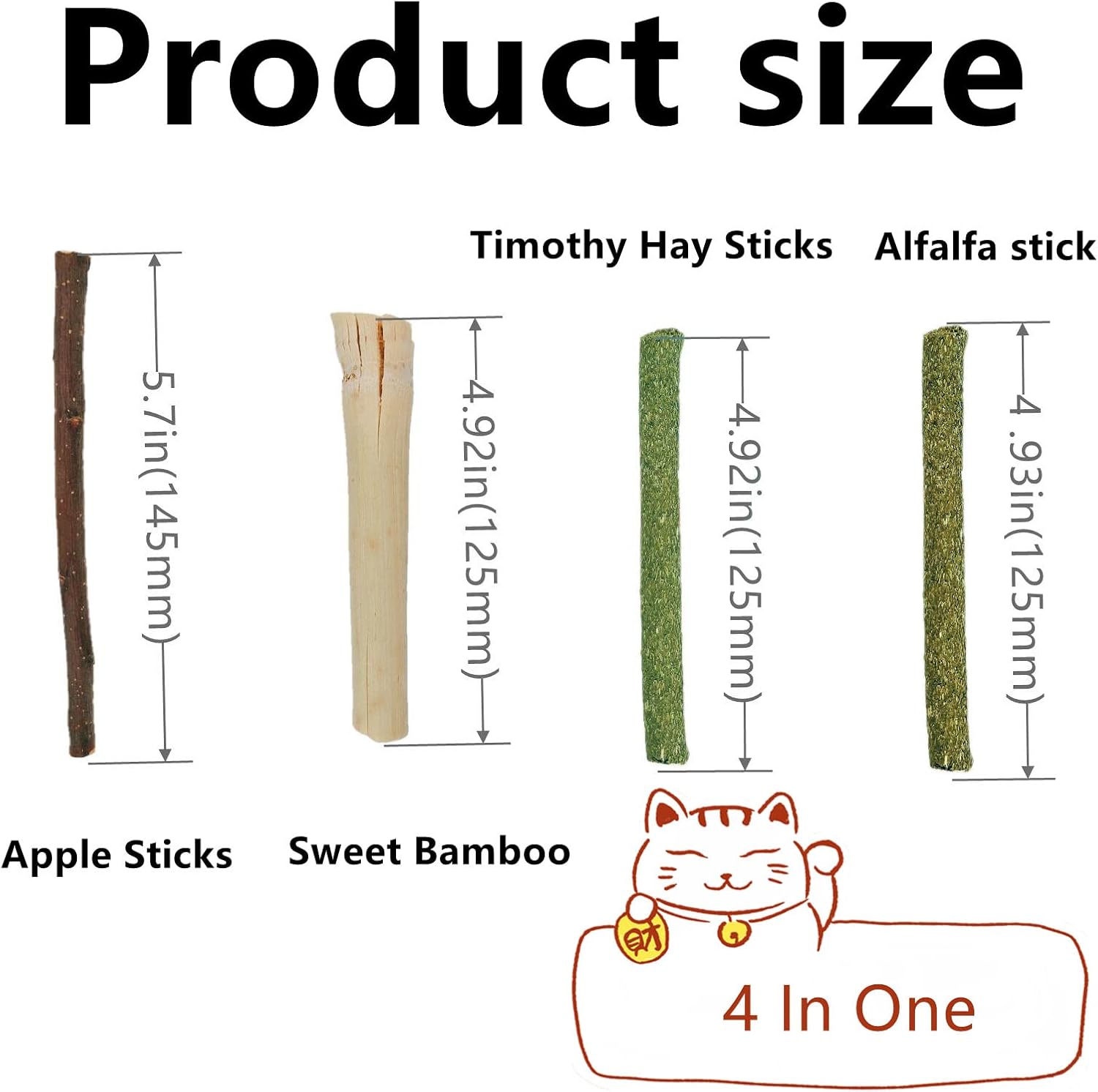 2.【4 in 1】:A pack of 4 flavors solves your selection difficulties and meet all need of small animals.The apple branch wood+ sweet bamboo+hay stick+Alfalfa stick are good for your little animal. Different flavors and nutrition dietary fiber can promote the digestion of your little pet, also make their hair and fur more beautiful.