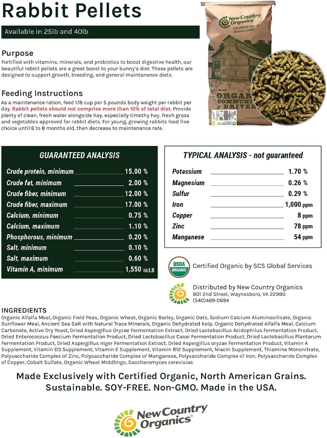 About this item Nutrient Dense Pellets for All Stages of Rabbits Fortified with Probiotics, Vitamins, and Minerals to Promote Digestive Health Rich in Fiber Certified Organic, Non-GMO & Soy-Free Freshly made with organic grains from the USA and Canada
