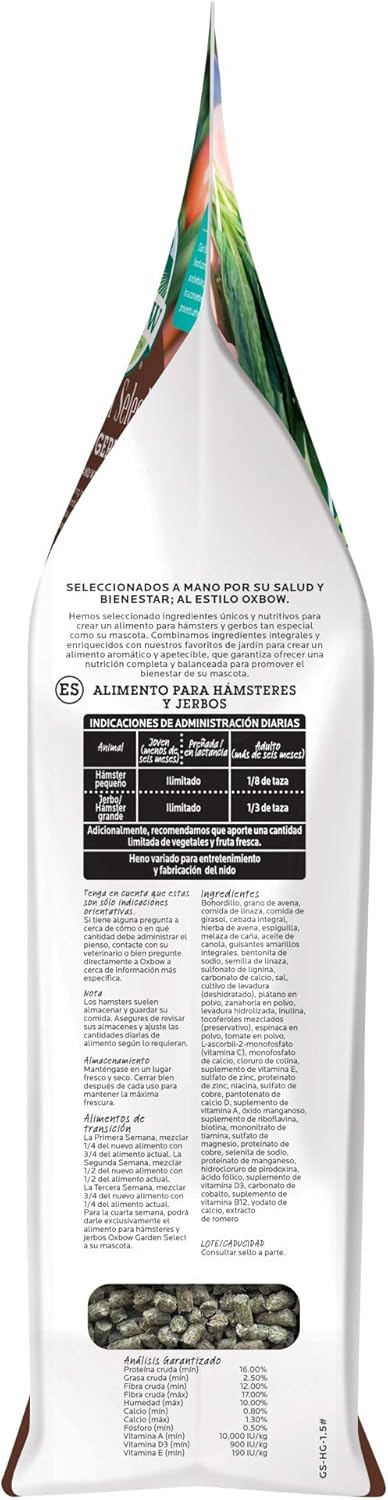 Oxbow Garden Hamster And Gerbil Food is the premium option for hamsters and gerbils with a discerning palate. This uniform food provides essential vitamins and minerals hamsters and gerbils need to thrive. Uniform pellets provide complete nutrition in every bite and prevent selective feeding. All Oxbow foods are formulated with the guidance of leading small animal veterinarians and nutritionists to provide specialized nutrition for the health and wellbeing of small pets.