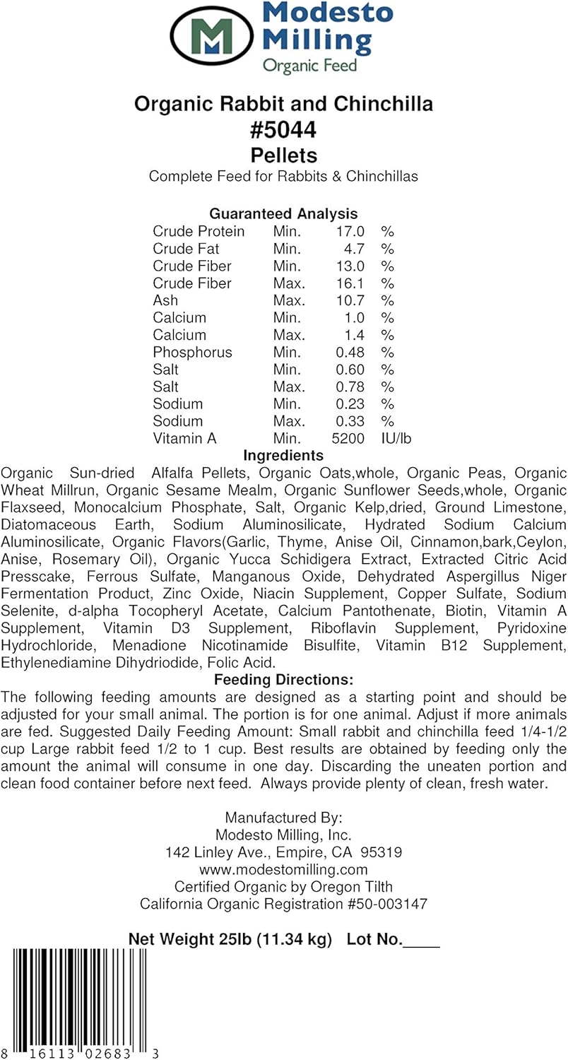Modesto Milling Organic Non Soy/Corn pelleted rabbit food supports health in both rabbits and chinchillas. Formulated to support all purposes and life stages, including growth, maintenance, lactation, fur development and show animals. Certified organic sun dried alfalfa provides high fiber. Formulated without corn and soy and has been balanced to support a healthy, happy pet.