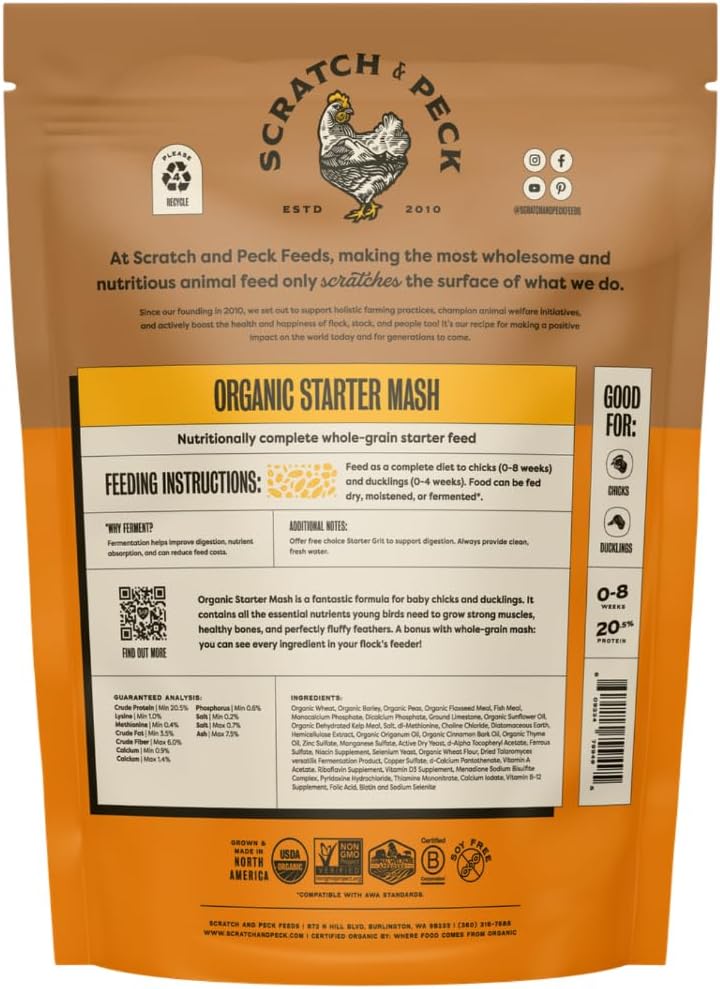 Scratch and Peck Whole Grain Starter Mash for Baby Chicks and Ducklings – 10 lb Bag – Corn and Soy-Free Feed with 20.5% Protein, Certified Organic and Non-GMO