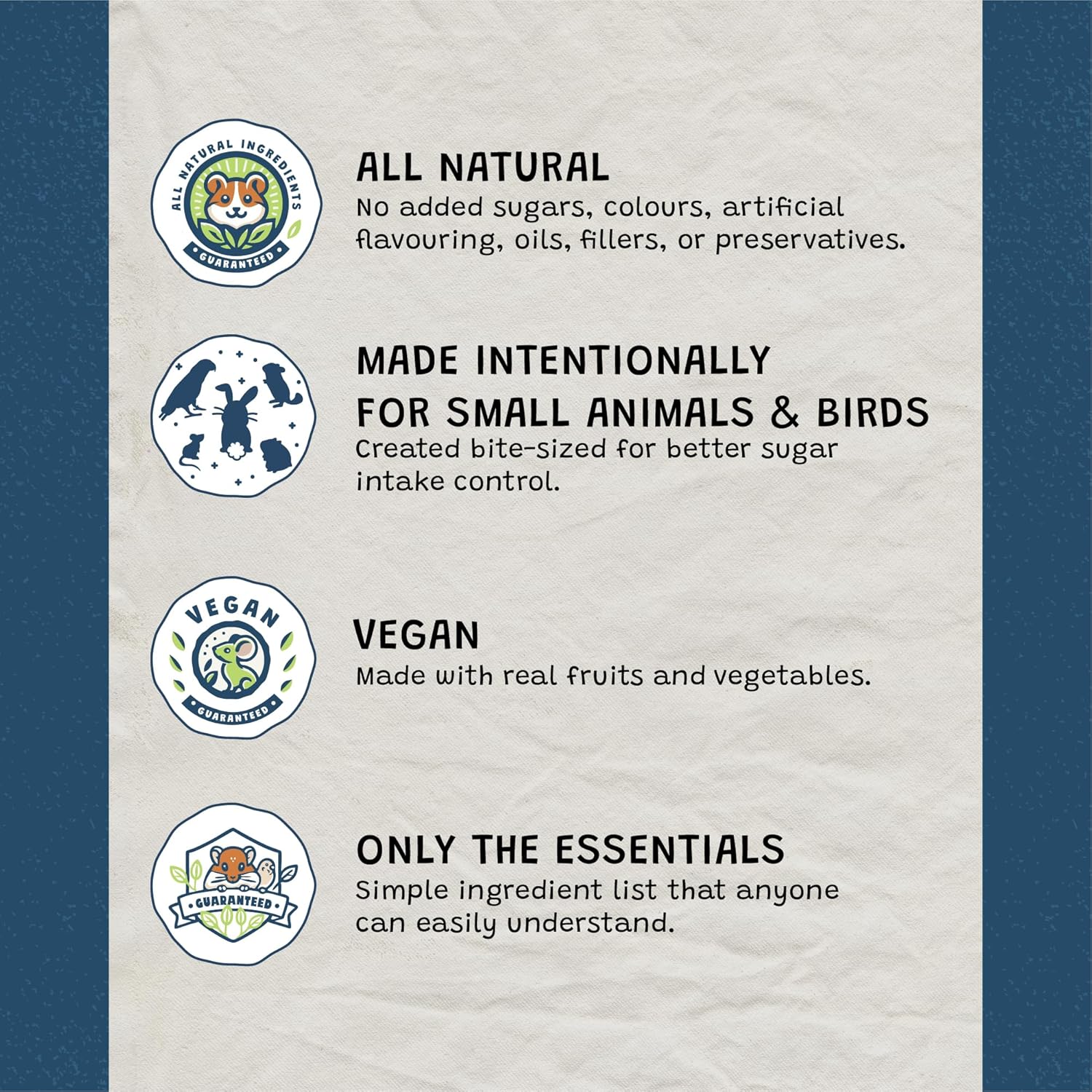 [FORMULATED FOR SMALL ANIMALS] – Each package contains 7 delicious flavors: Pumpkin Cilantro, Strawberry, Mixed Berry, Mixed Greens, Papaya, Banana Apple, Raspberry. Each flavor is intentionally chosen for rabbits, hamsters, guinea pigs, chinchillas, rats, mice, gerbils, and other small animals. This is a perfect choice for rodents who are picky eaters or if you are unsure which flavor your pet will enjoy the most. A 50g package contains approximately 50-55 bite-sized pieces
